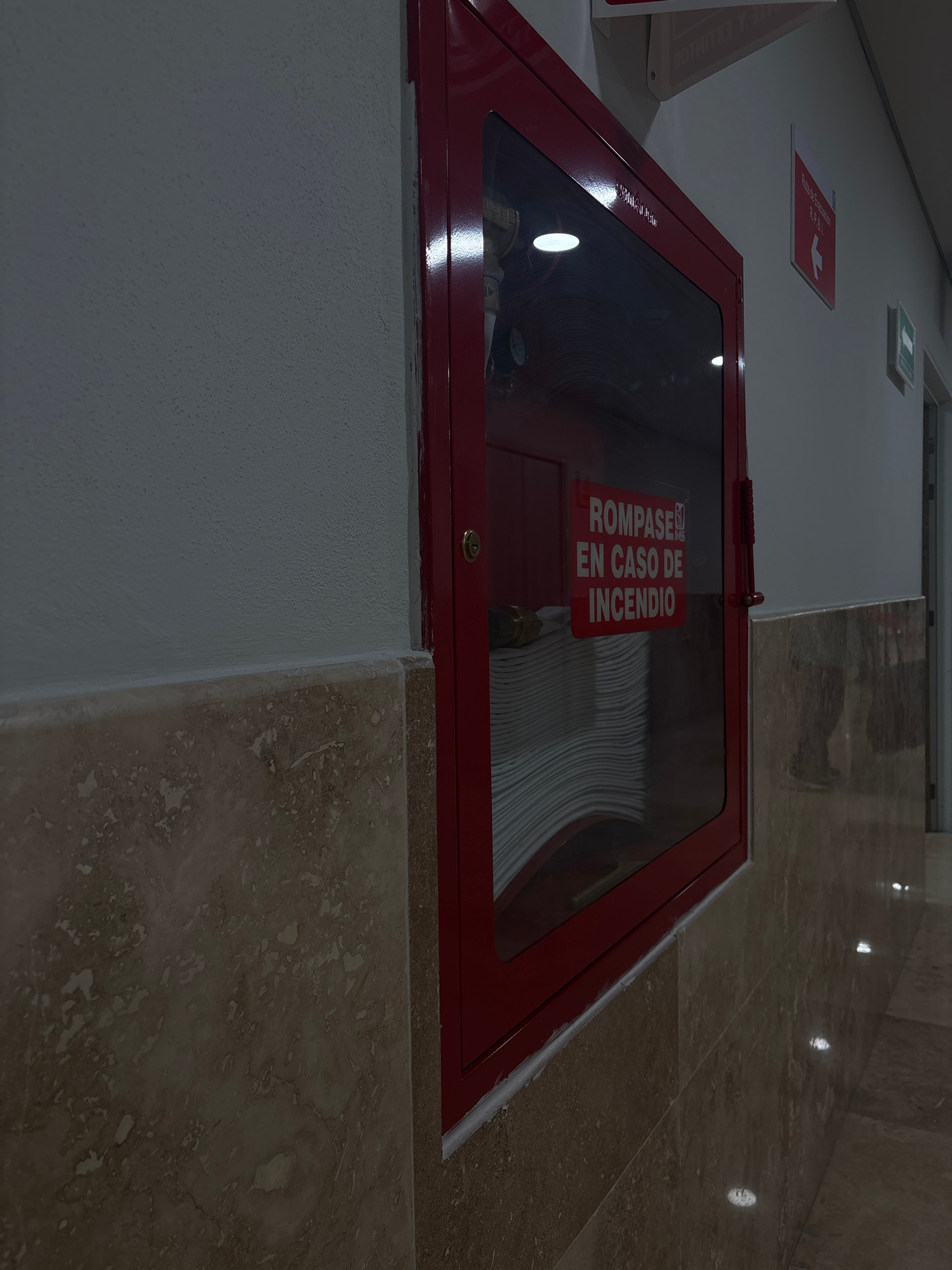 The image shows a fire hose cabinet recessed into a wall with a marble baseboard. The cabinet is red and has a glass front with a sign in Spanish that reads "ROMPASE EN CASO DE INCENDIO" (Break in cas…read more