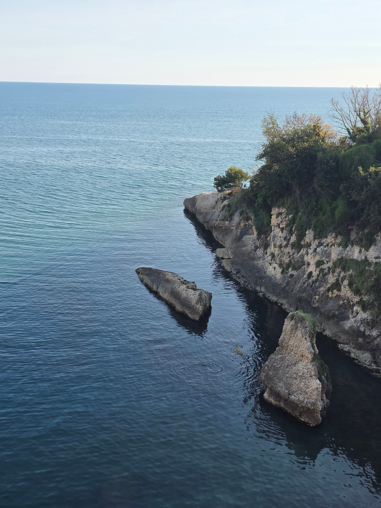 This image captures a view of the coastline of Ulcinj - Ulqin, Montenegro. The dominant feature is a rocky cliff jutting into the clear, blue water. The cliff is topped with green vegetation, including trees and shrubs. Several large rocks are situated near the base of the cliff, partially submerged in the water. The sea is calm, with subtle ripples visible on its surface. In the distance, the horizon is a pale blue, suggesting a clear sky. The image is taken from an elevated perspective, possibly from a nearby cliff or building. | Open Wire