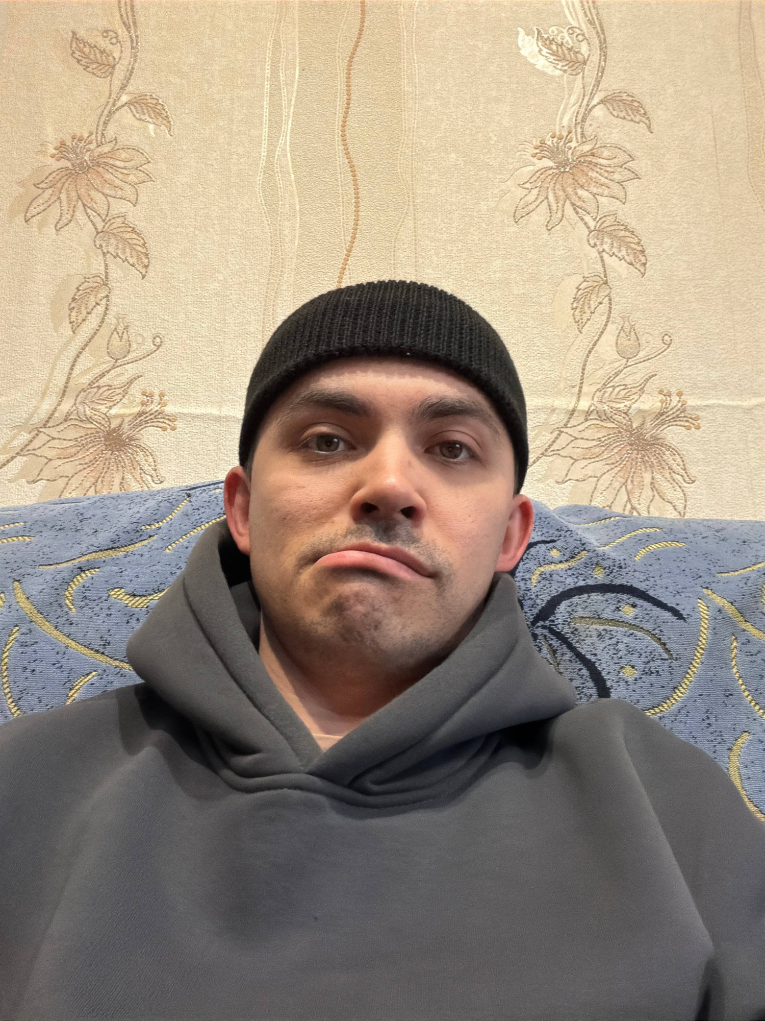 A close-up, rotated portrait photograph shows a man wearing a black beanie and a gray hooded sweatshirt. He is lying down, with part of a blue patterned sofa visible behind him and wallpaper with a fl…read more
