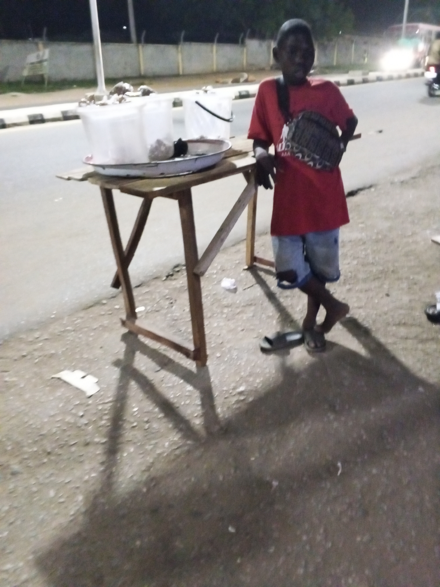 A young boy stands next to a makeshift wooden table on the side of a road in Adankolo, Nigeria. He is wearing a red t-shirt, denim shorts, and sandals, with a patterned crossbody bag. On the table areβ¦read more