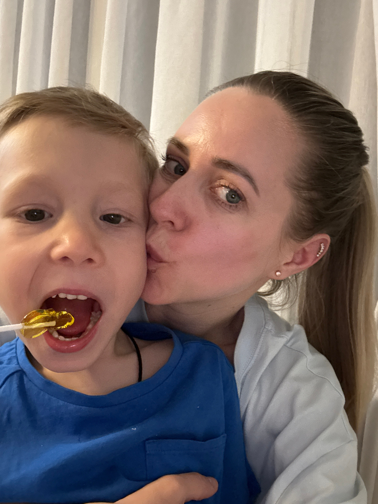A woman and a child are posed in a selfie. The woman, with her blonde hair pulled back in a ponytail, is kissing the child’s forehead. The child has blond hair and is wearing a blue shirt. The child h…read more