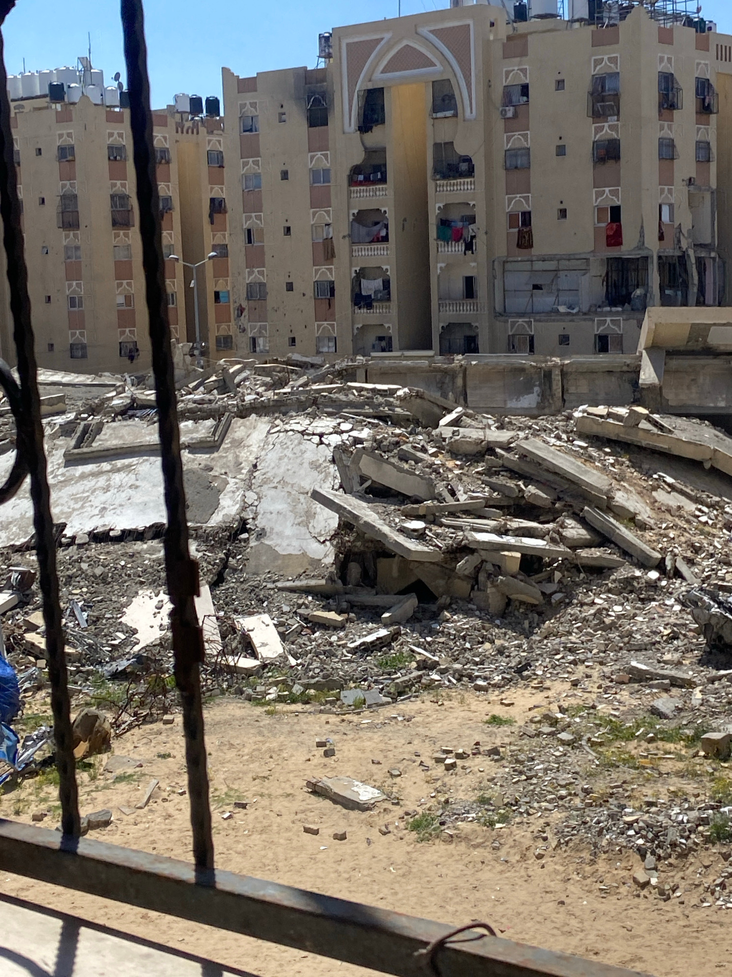 The image depicts a scene of destruction in what appears to be an urban area, likely Khan Yunis in the Palestinian Territory. A multistory building stands to the left, showing signs of damage. Adjacen…read more