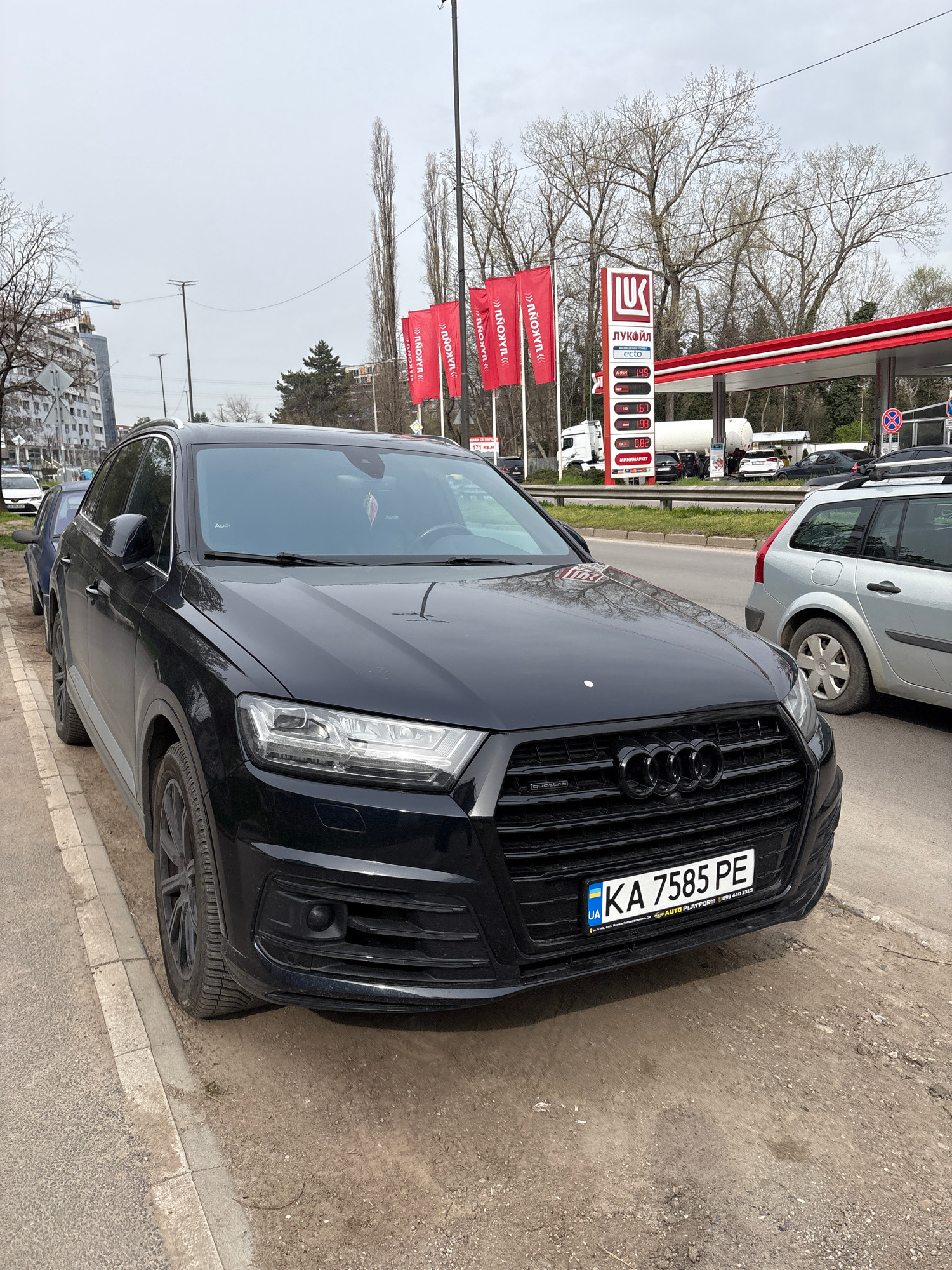 The image shows a black Audi Q7 parked on the side of the road. The car has a license plate with the number "KA 7585 PE". The license plate also indicates that the car is registered in Ukraine. Behind…read more