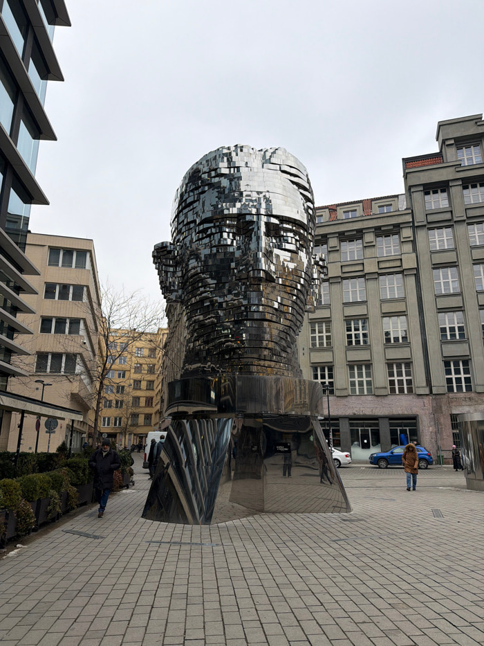 The image depicts the kinetic Franz Kafka Head sculpture by David Černý, located in front of the Quadrio shopping center in Prague, Czechia, on an overcast day. The large, polished stainless steel scu…read more