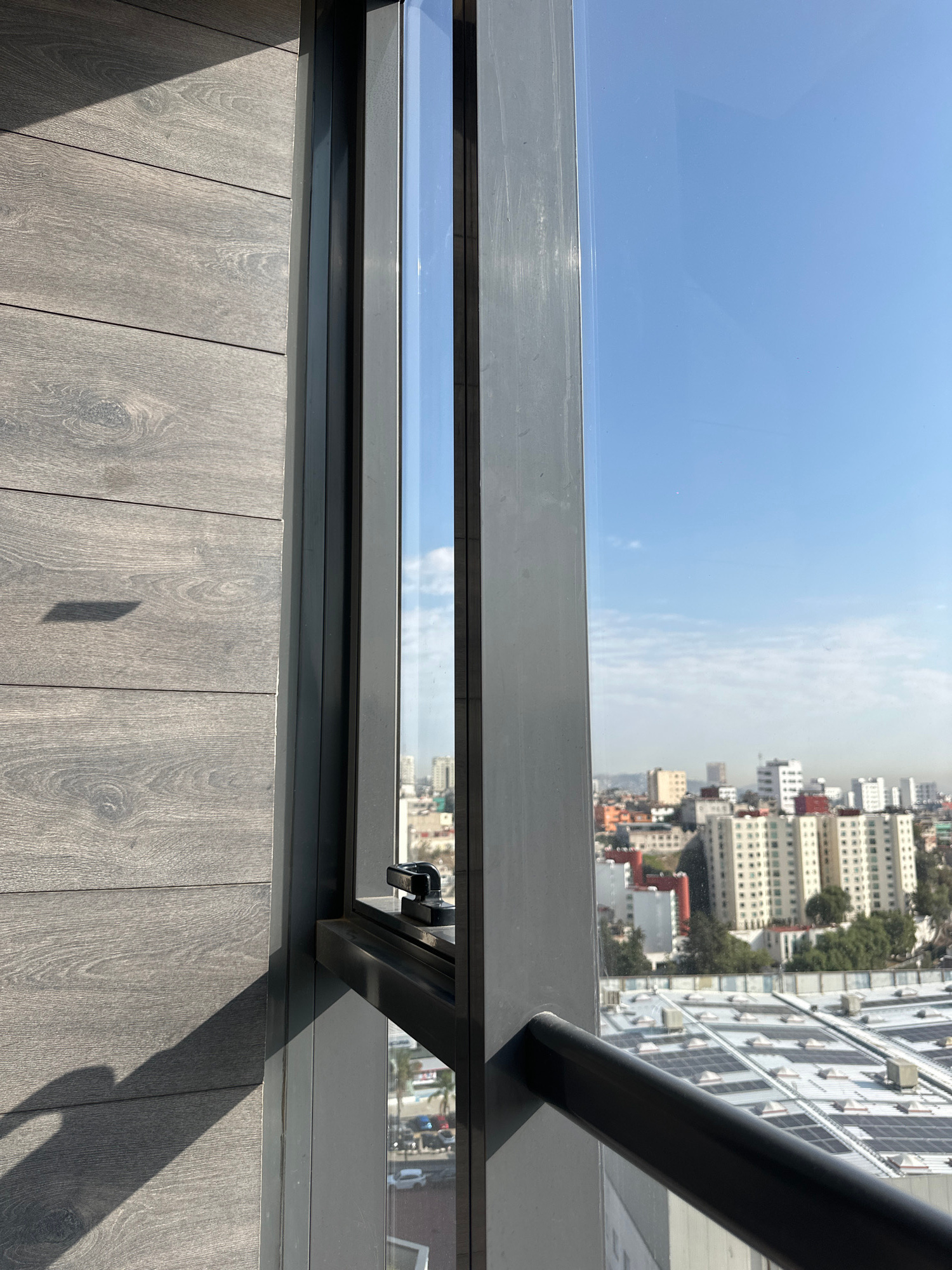 The photograph shows an elevated perspective of a cityscape from a high-rise building in Huixquilucan de Degollado, Mexico. The scene is viewed through a partially opened window, with a grey metal fra…read more