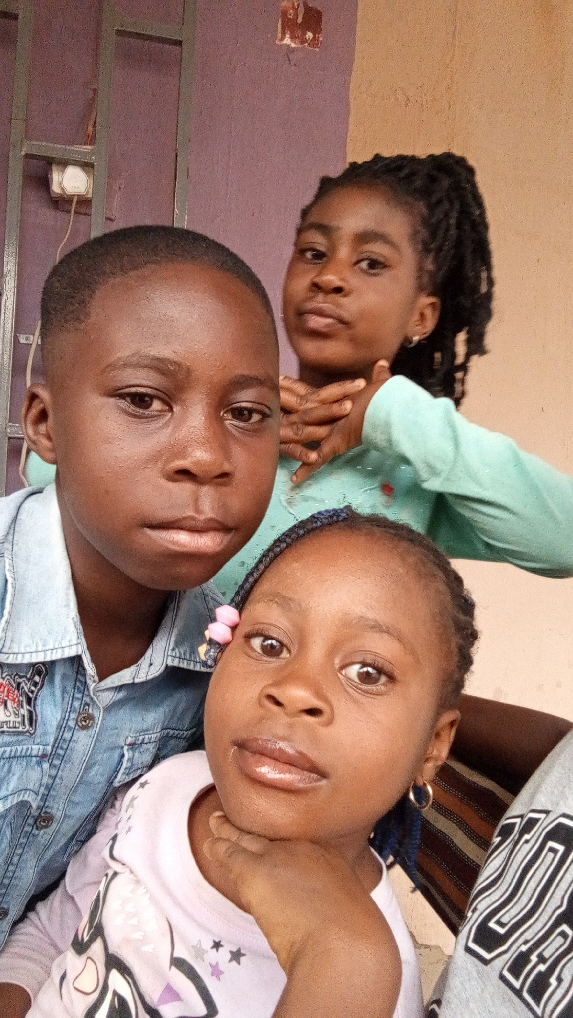 The image shows three children posing for a photograph. The location is Sabon Tasha, Nigeria. In the foreground, a boy with short hair is wearing a denim jacket. Below him, a girl with braids and a p…read more