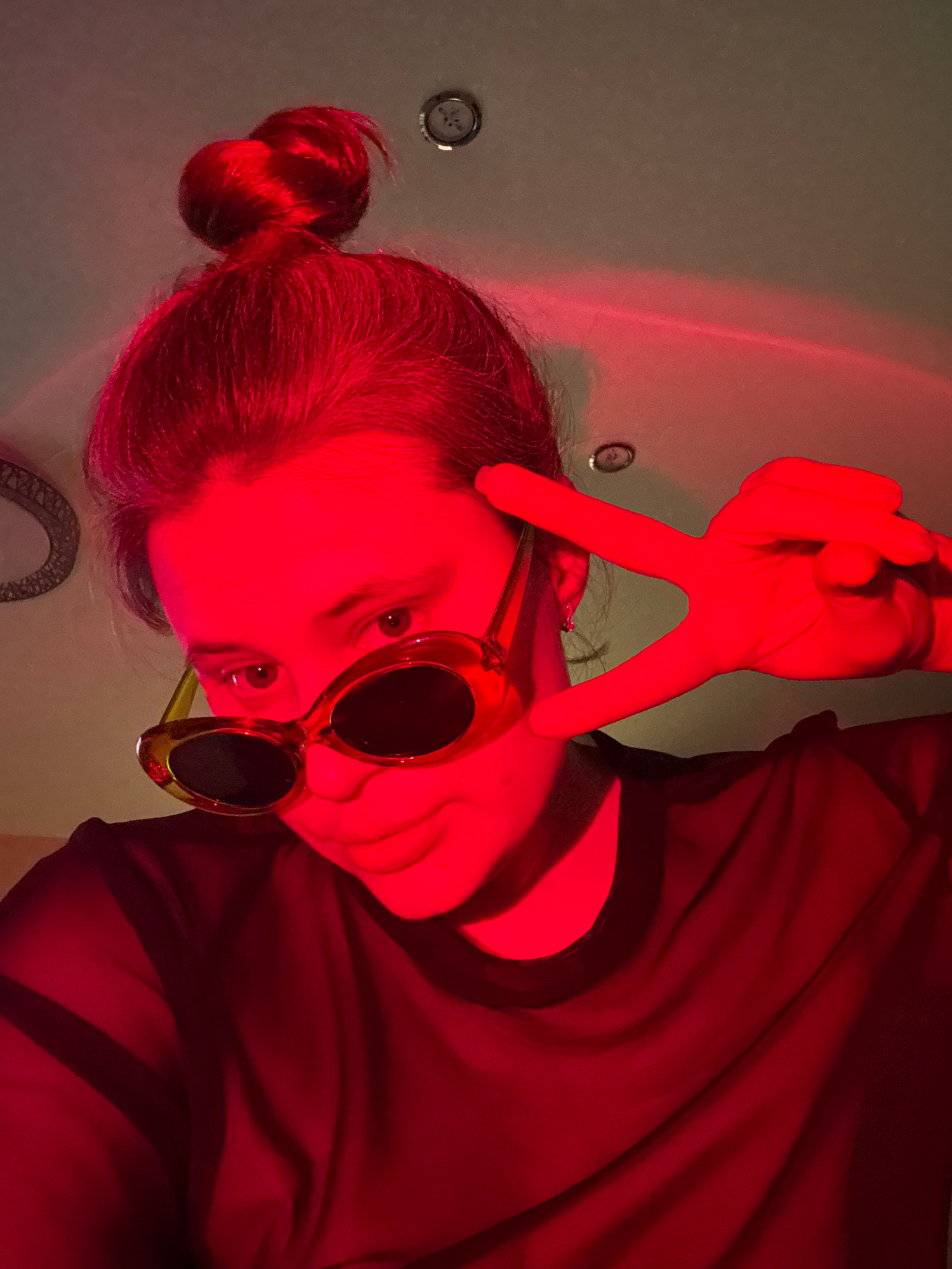A person with their hair in a bun is photographed from below while wearing sunglasses and making a peace sign with their hand. The scene is illuminated with a red light. The setting is a light-colored…read more
