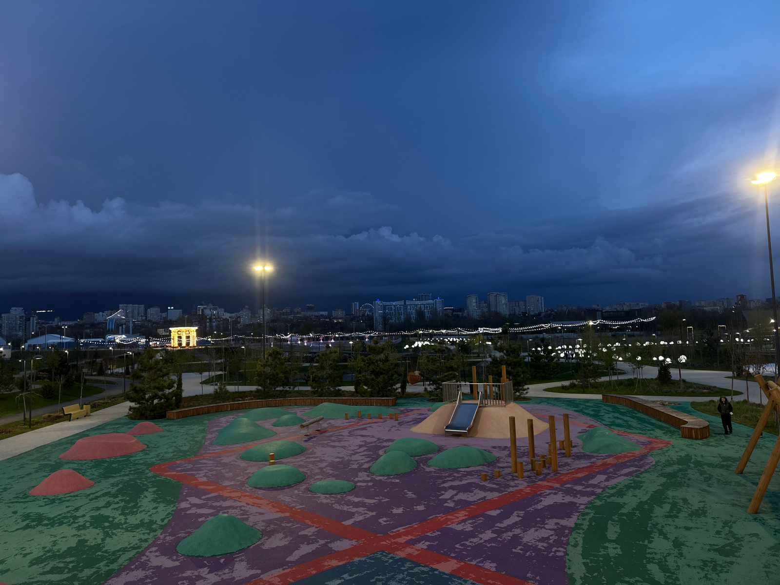 The image shows a brightly lit playground in the foreground, located in the city of Ovoshchnoy, Russia, at dusk or early evening. The playground features a variety of play structures including colorfu…read more