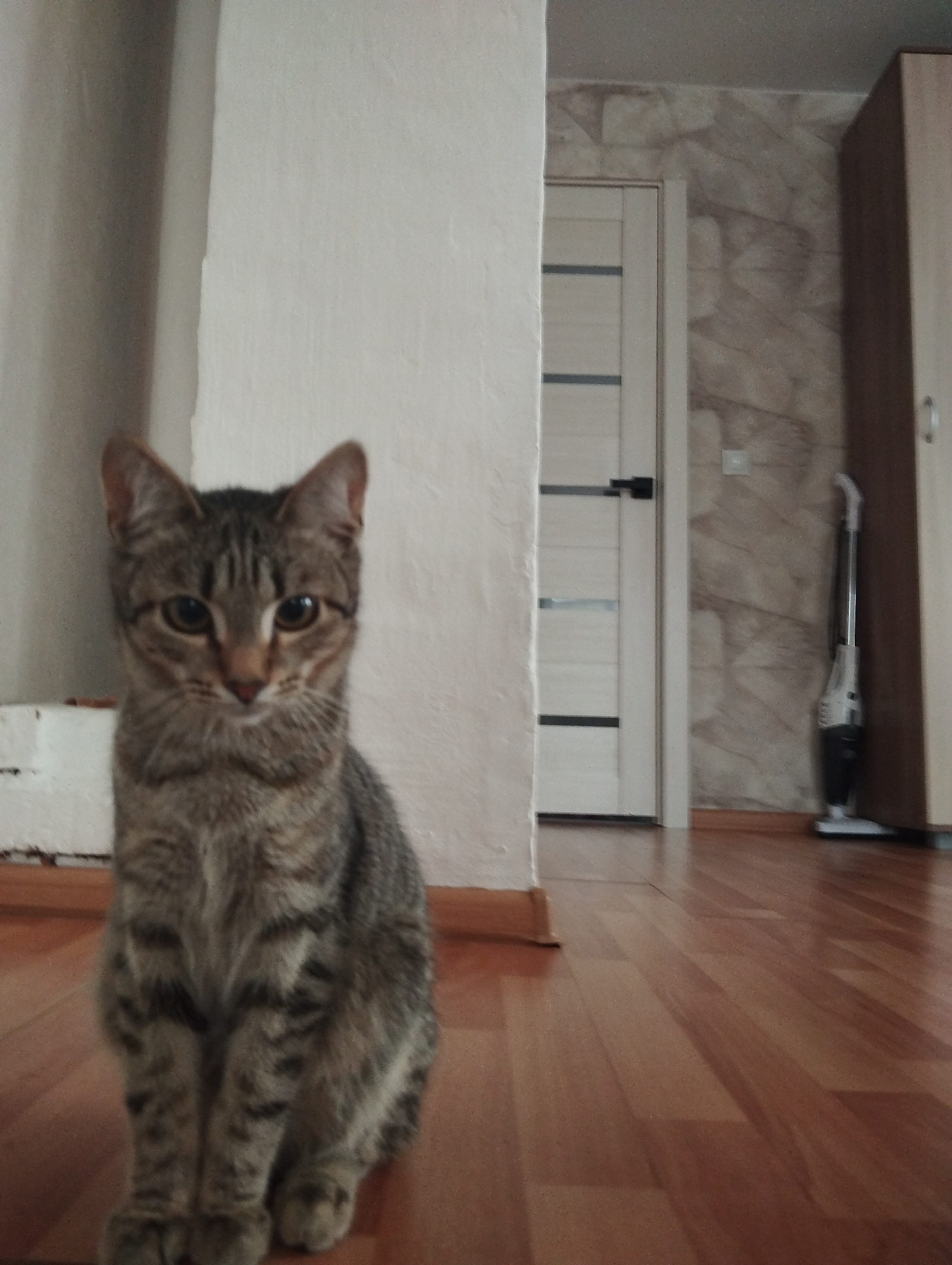 A gray tabby cat is sitting on a wooden floor in what appears to be a room in a home. The cat is facing the camera. Behind the cat is a white wall or partition. Further back in the room, there is a wh…read more