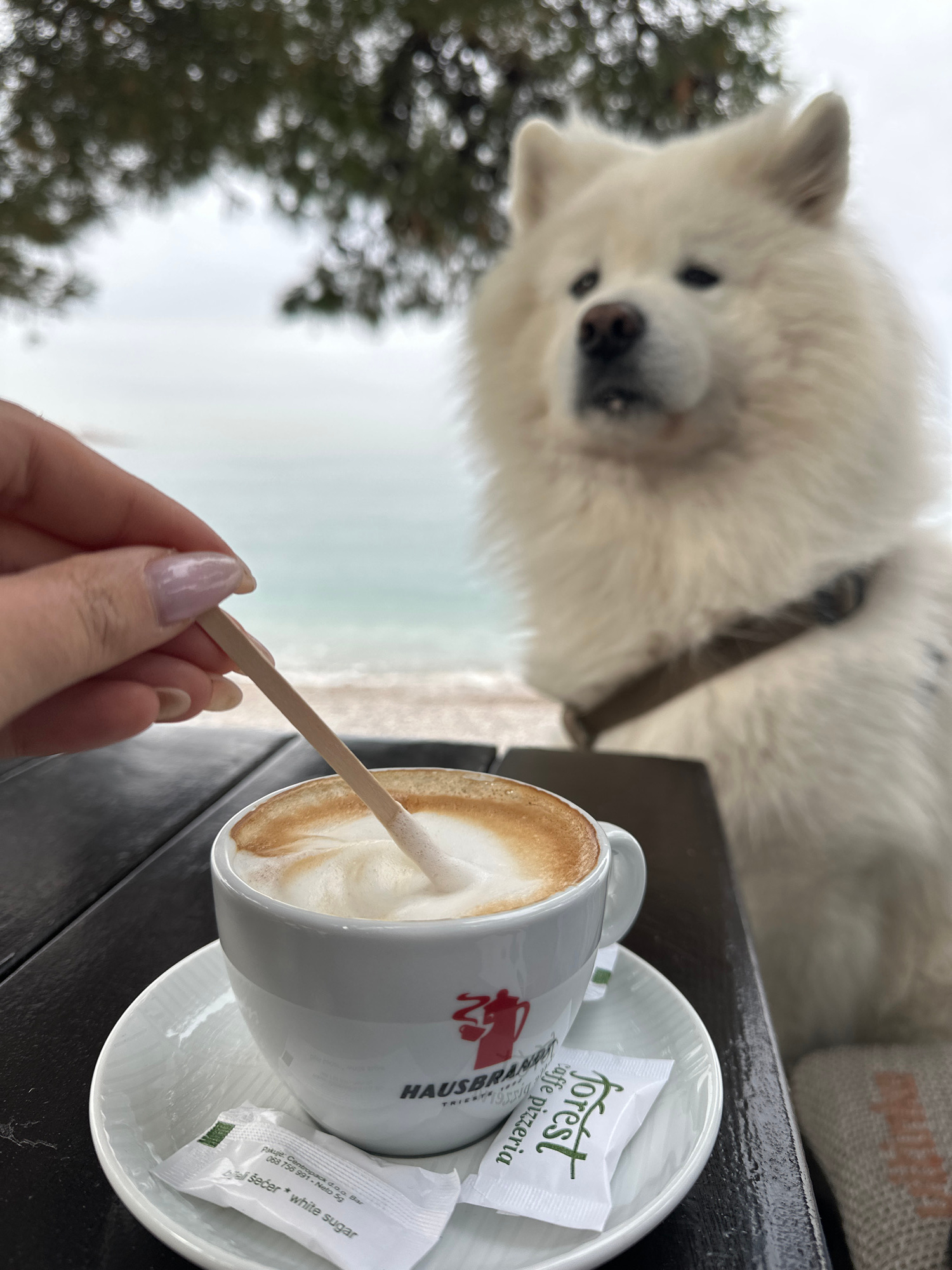 A close-up shot presents a cup of cappuccino on a black table, with a white saucer holding a "forest caffe pizzeria" sugar packet. A hand stirs the coffee with a wooden stick. In the background, a lar…read more
