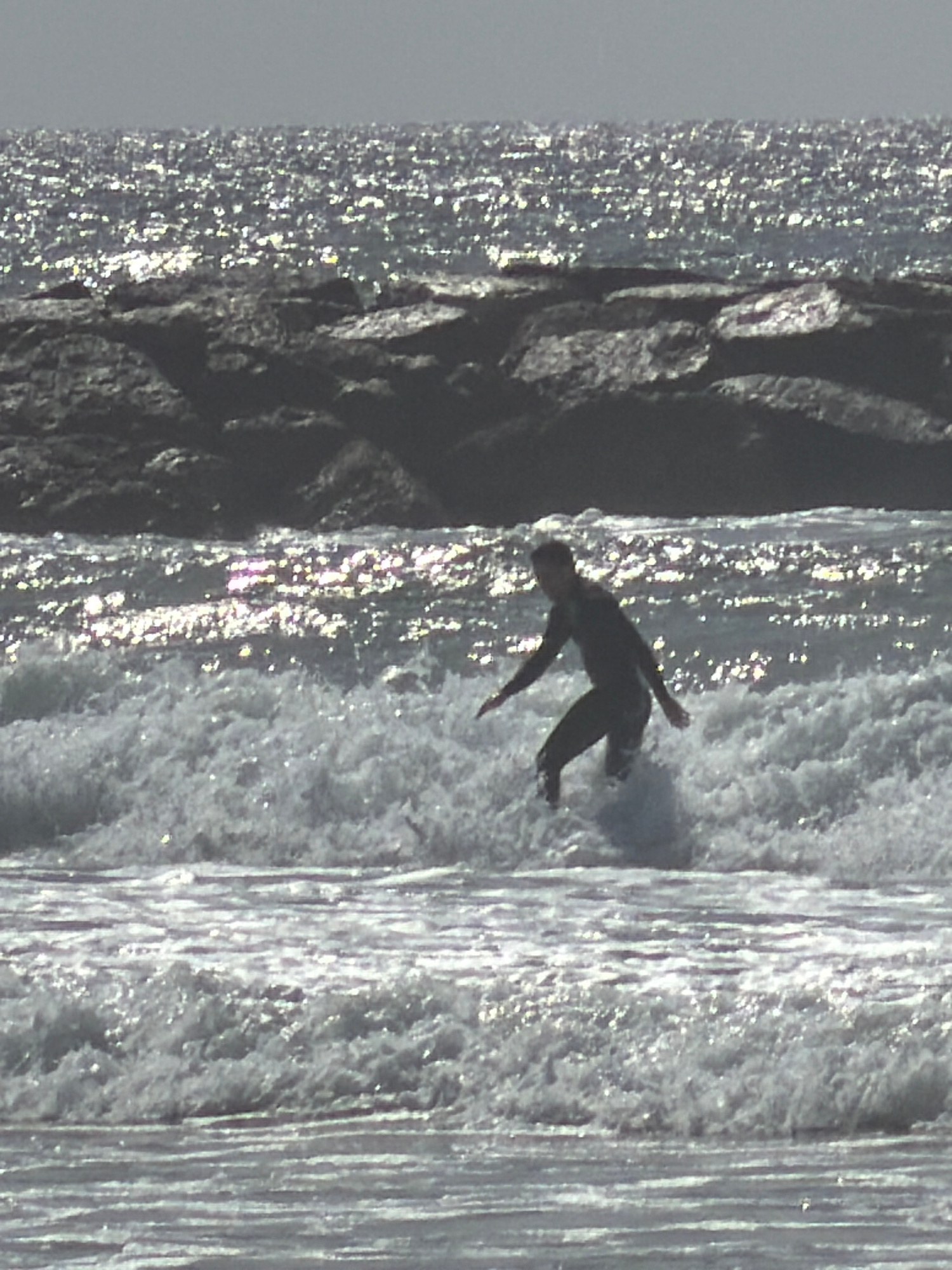 A person in dark clothing is falling or diving off a dark cliff or ledge into a body of water that appears to be a waterfall or rapidly flowing river. The water reflects sunlight. There is no visible…read more