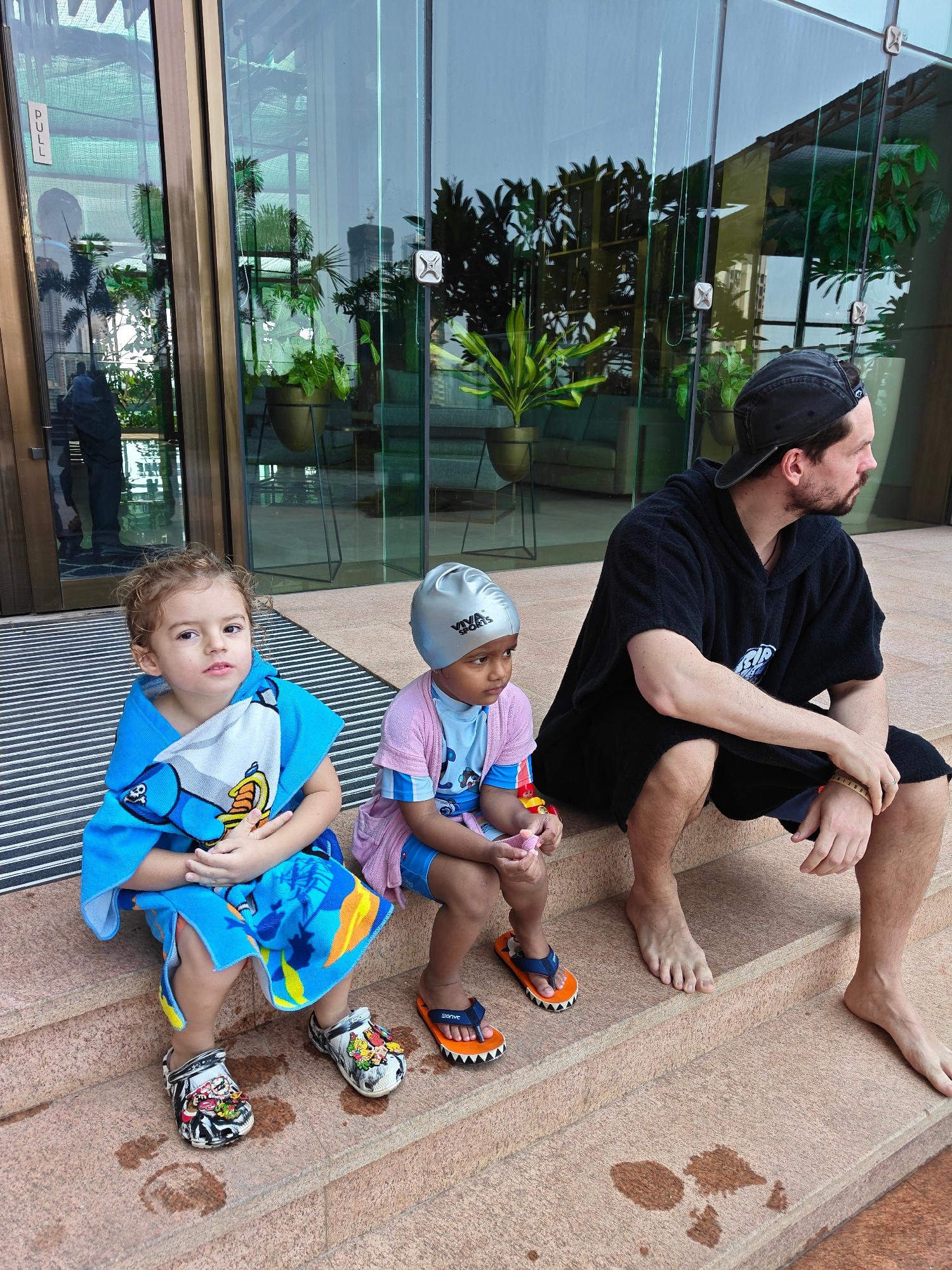 Outside a glass-walled building with a "PULL" sign visible on the door, three figures are seated on tan-colored steps. A young child, wrapped in a blue towel with cartoon imagery, sits to the left, weβ¦read more