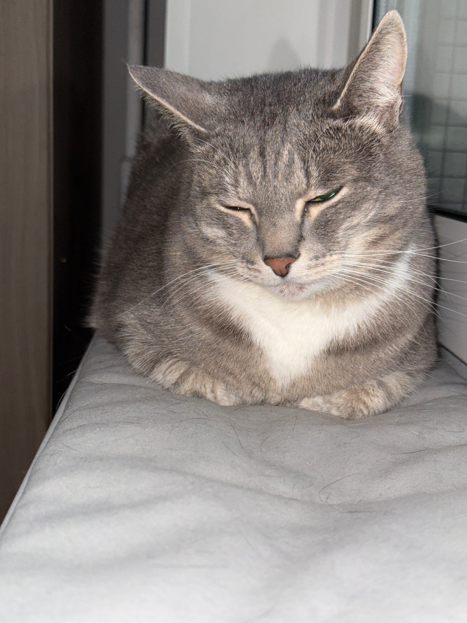 A close-up shot shows a gray tabby cat resting its head on a light gray pillow. The cat is positioned on its side, with its head angled towards the left. It has a pink nose, partially closed eyes, and…read more