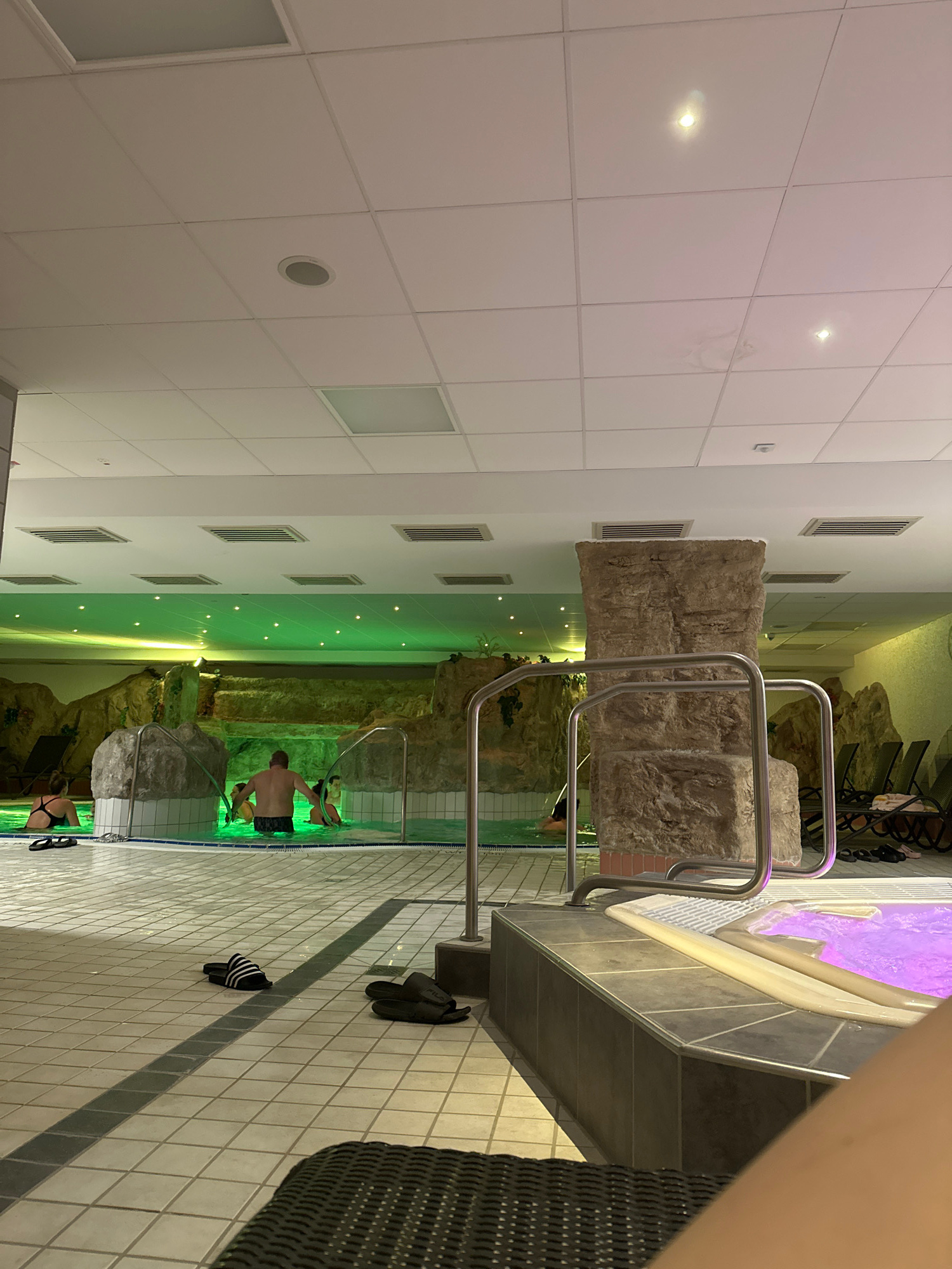 This indoor scene depicts a pool area, possibly a spa or wellness center, located in Gunzenhausen, Germany. The location includes a large pool with rock-like features and green lighting, complemented…read more