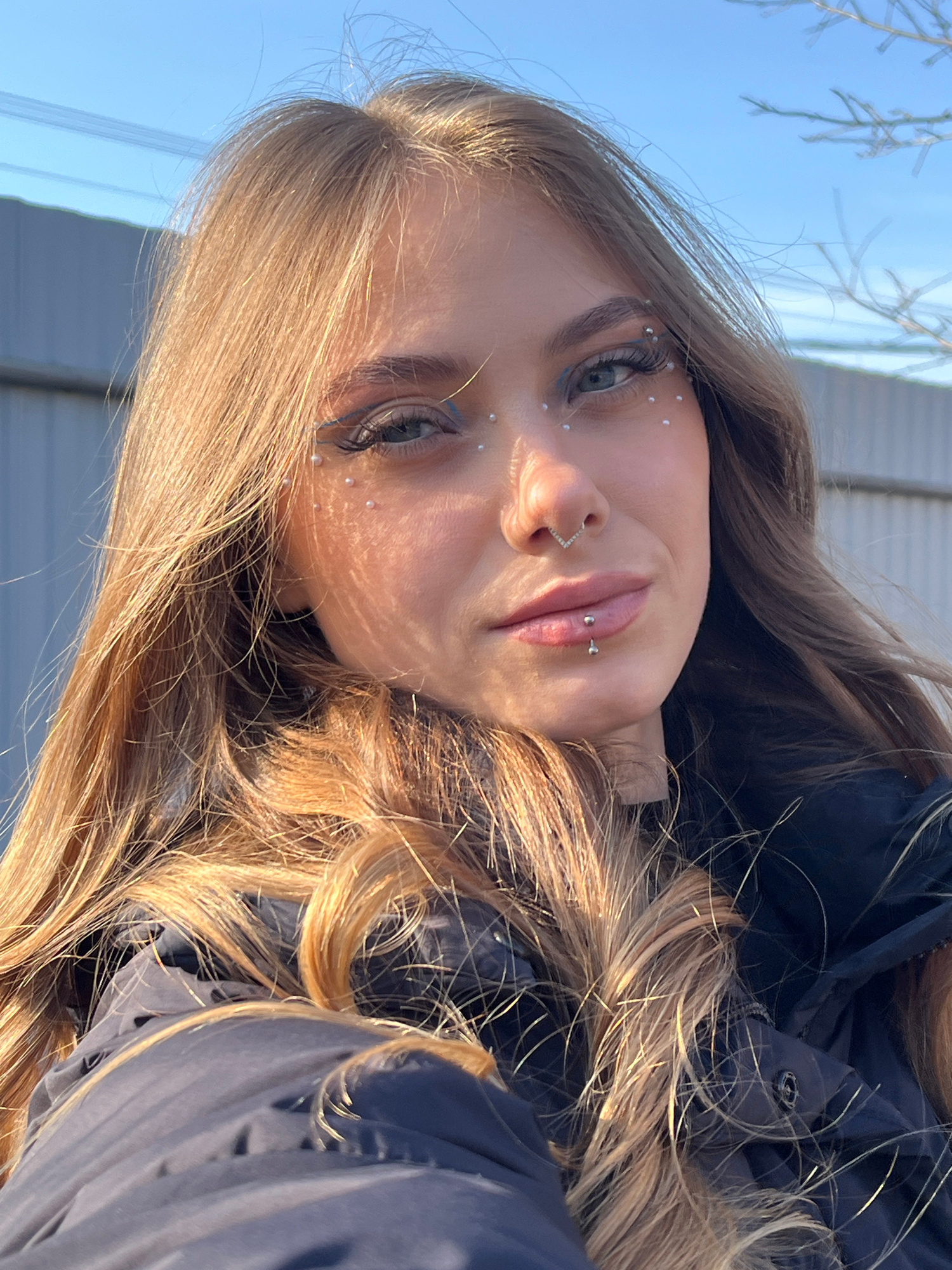 A young woman is depicted outdoors on what appears to be a sunny day. She is wearing a dark-colored jacket and has long, wavy blonde hair. She has noticeable makeup, including eyeliner and small white…read more