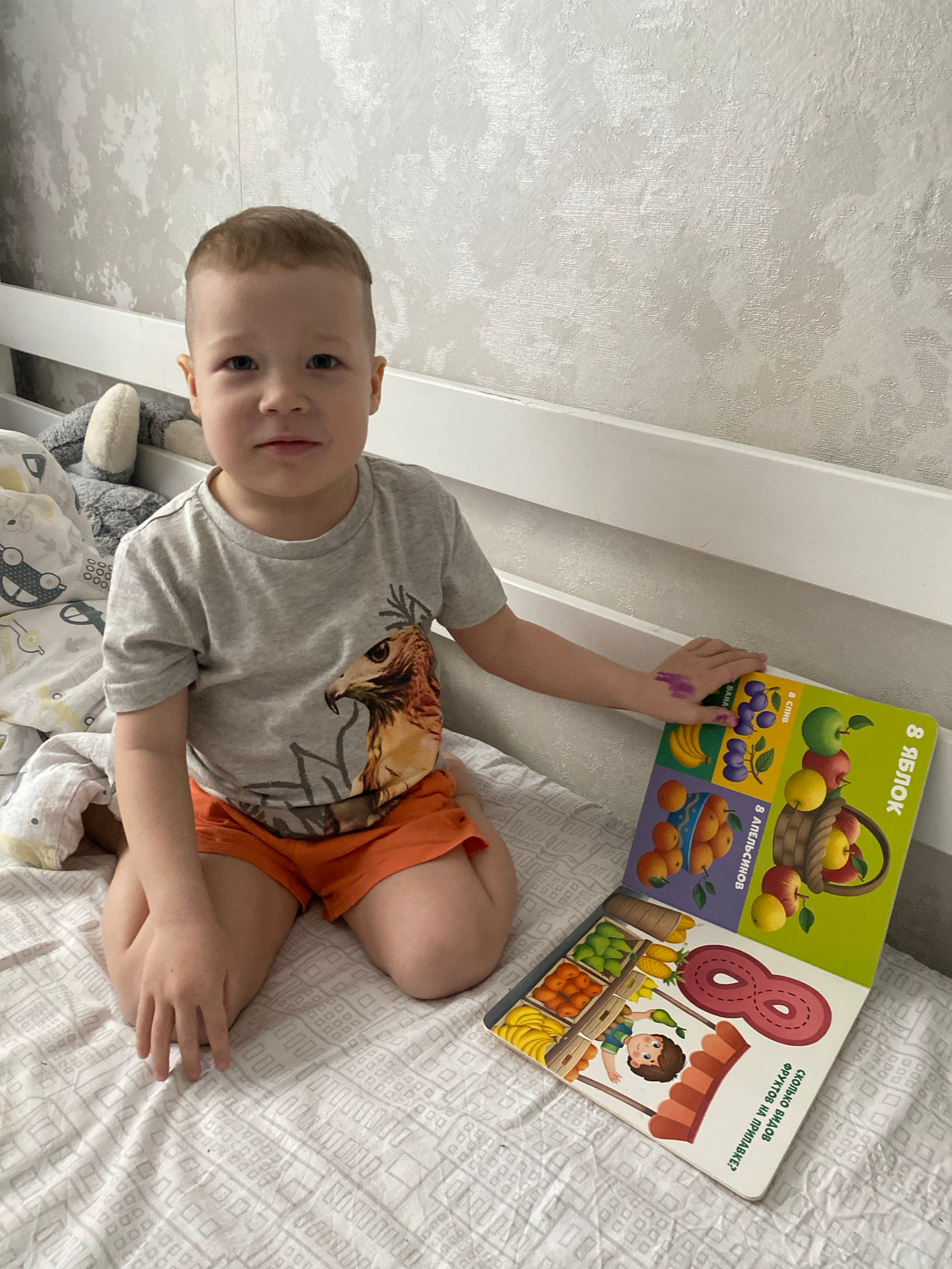 A young child is lying on a bed with a book open next to them. The book has illustrations of fruits and the number eight written on it in Russian. The child is wearing a grey t-shirt and orange shortsβ¦read more