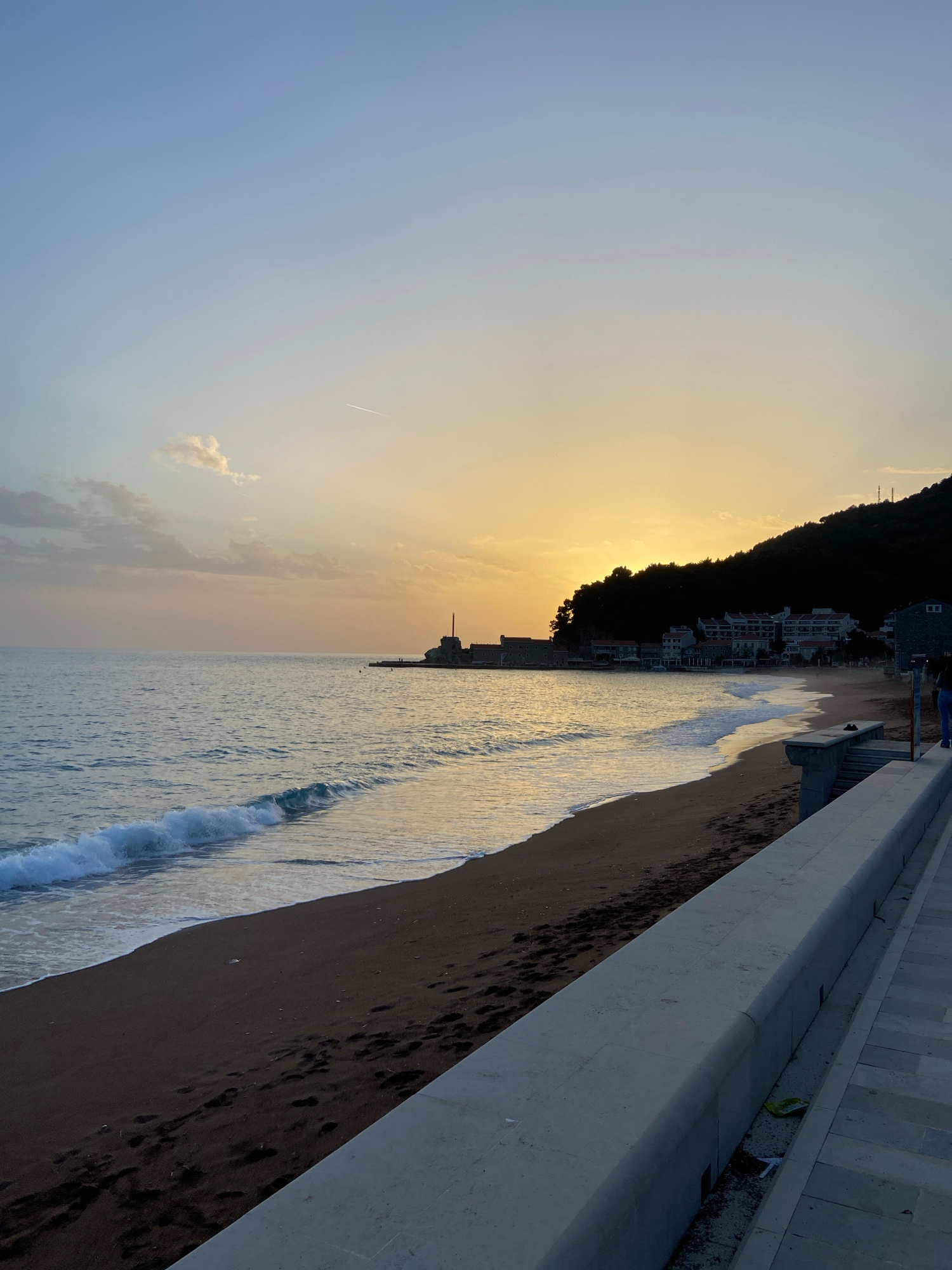 The image shows a beach scene at dawn or dusk in Petrovac centar, Montenegro. A dark, possibly volcanic sand beach is lined with waves. A concrete barrier runs along the edge of the beach. Beyond the…read more