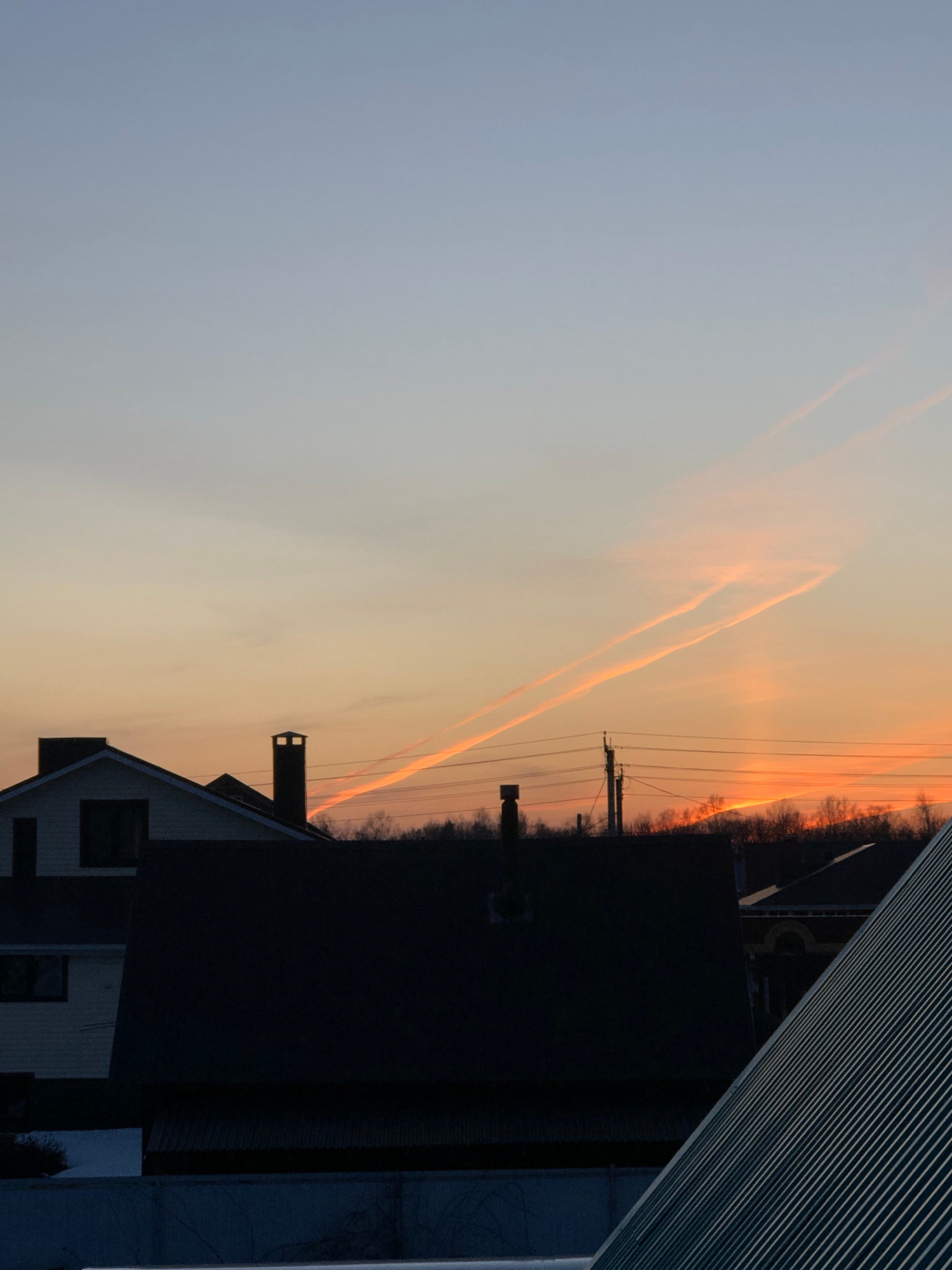 The image shows a view of the sky at sunset in Noviy, Russia. Contrails from airplanes are visible in the sky, illuminated by the setting sun. Power lines run across the frame. A residential building…read more