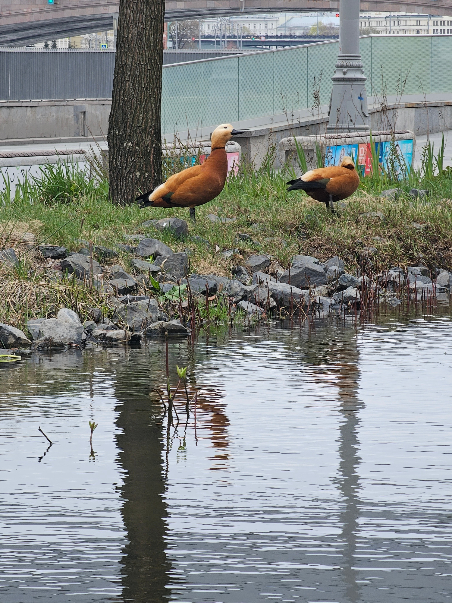 The image depicts two ruddy shelducks perched on a grassy embankment alongside a body of water, likely a river or pond, in an urban setting. The embankment is lined with rocks. The body of water refle…read more