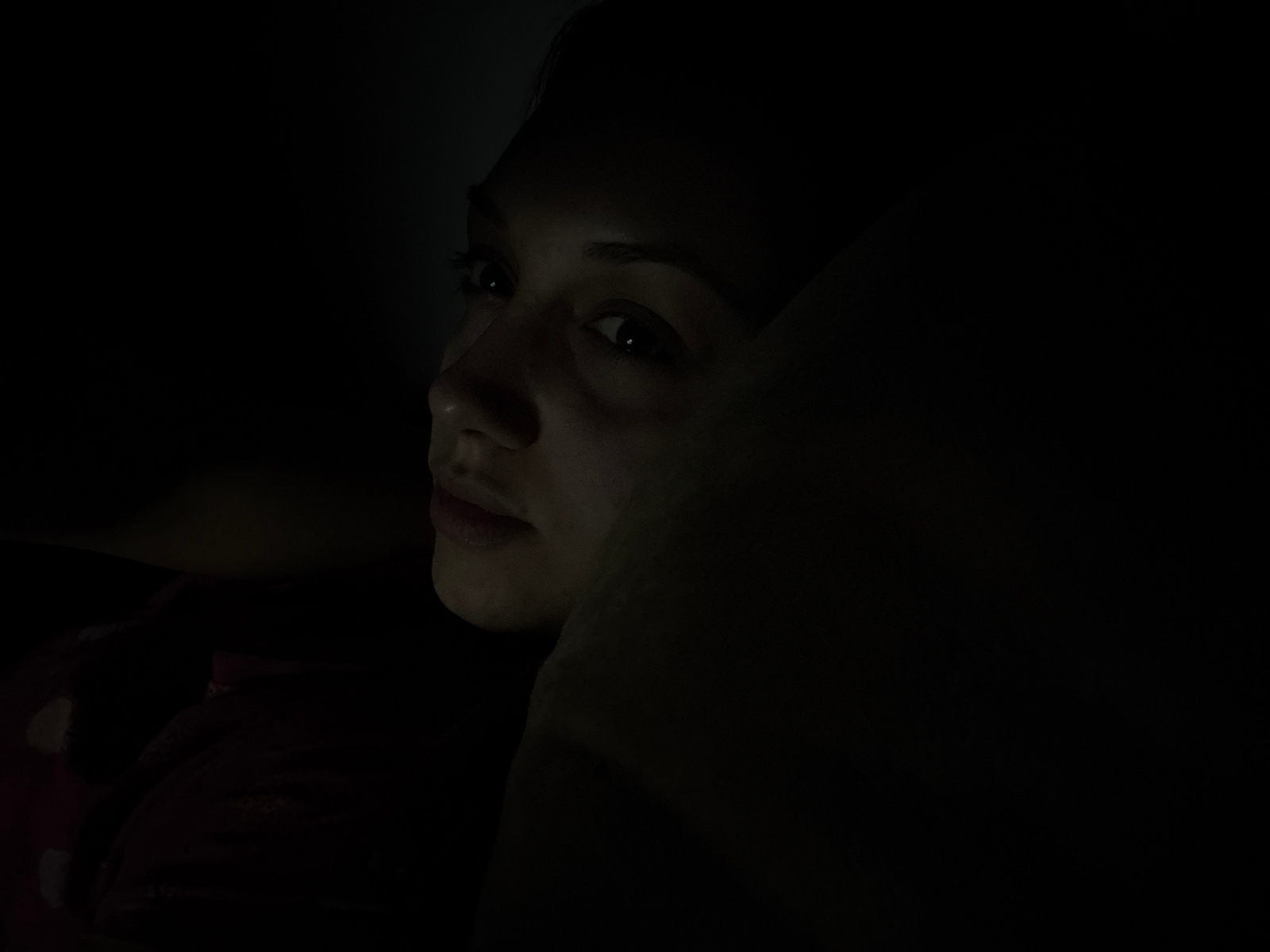 The image shows a person's face tilted downwards, with dark lighting obscuring much of the detail. Only the eyes, nose, and mouth are clearly visible. There is no indication of the person's gender or…read more