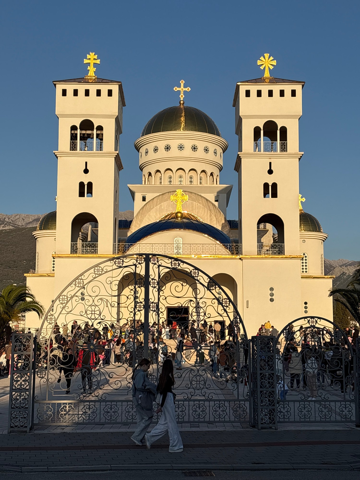 The image depicts a modern-style Orthodox church in the city of Bar, Montenegro. The architecture is characterized by two bell towers flanking a central dome, all painted in a light beige color with g…read more