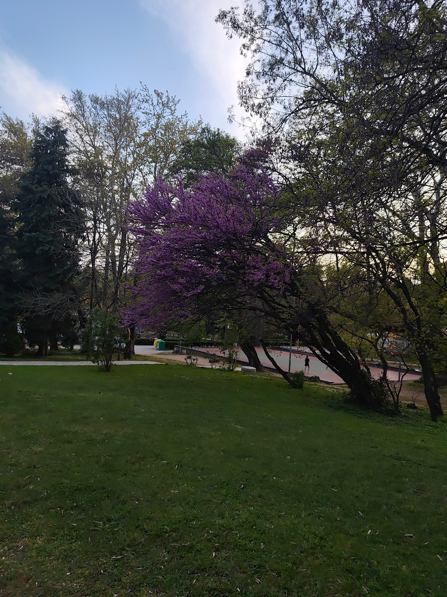 The image shows a park in Sandanski, Bulgaria. In the foreground, there is a grassy lawn. In the midground, a tree with vibrant purple flowers is prominently featured. Several other trees, some with b…read more