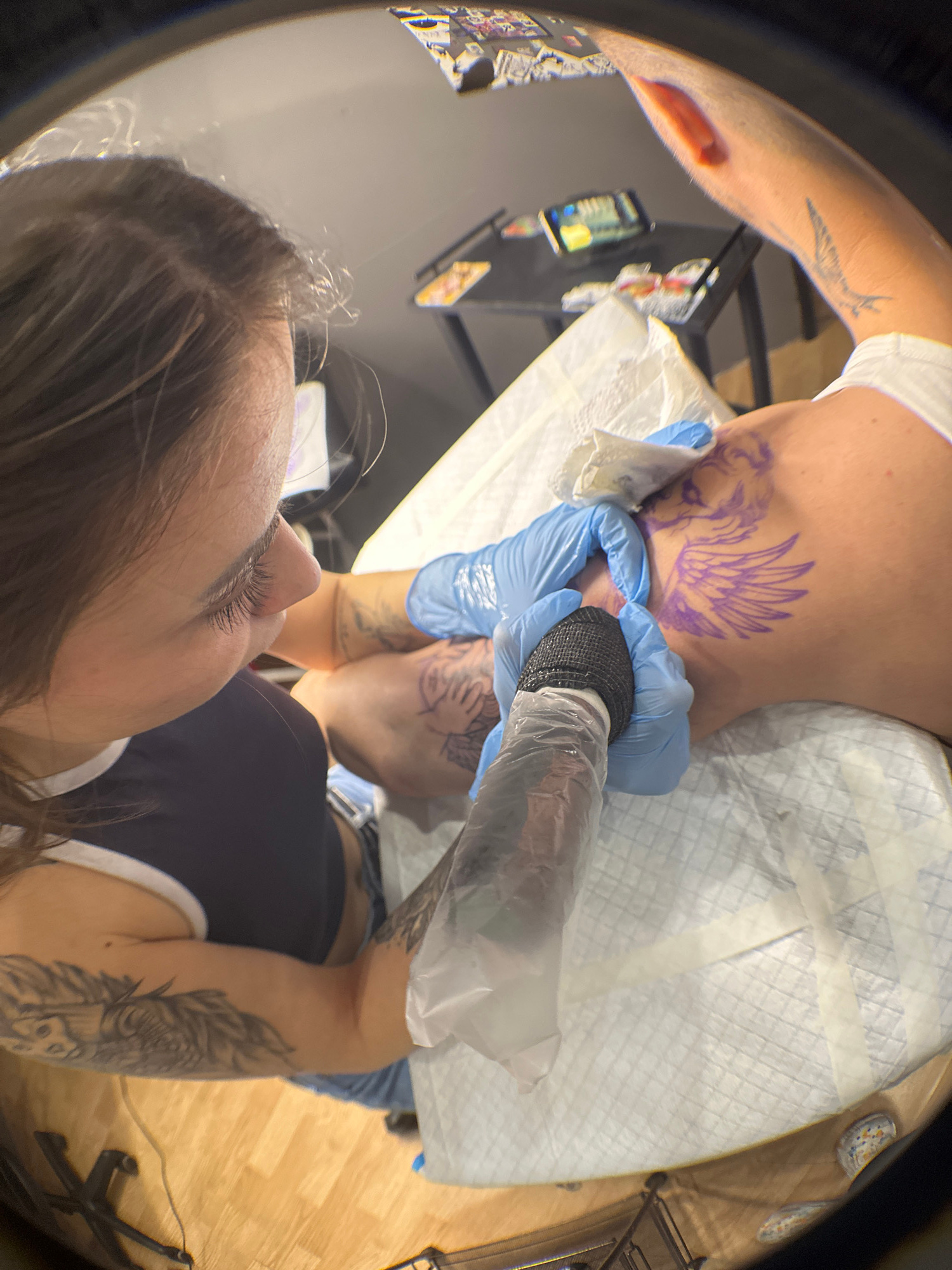 A wide-angle shot from above shows a tattoo artist in a tattoo studio. The artist, a woman with dark hair and fair skin, is wearing a navy tank top with white trim and has tattoos on her arm. She is f…read more
