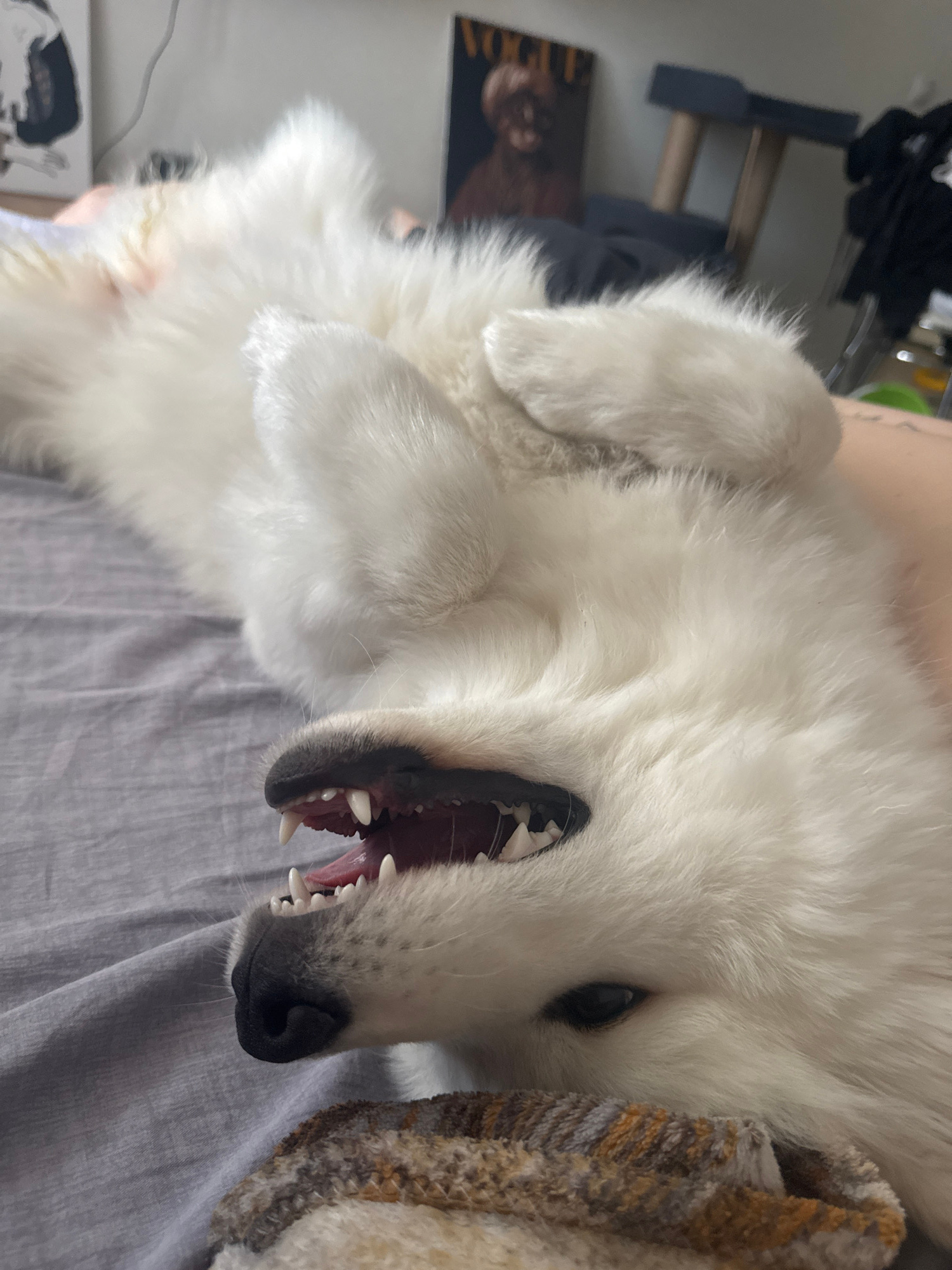 A white, fluffy dog lies on its back on a gray surface, possibly a bed or blanket. The dog's mouth is open, revealing its teeth and tongue. The background is somewhat blurred, but a magazine with the…read more