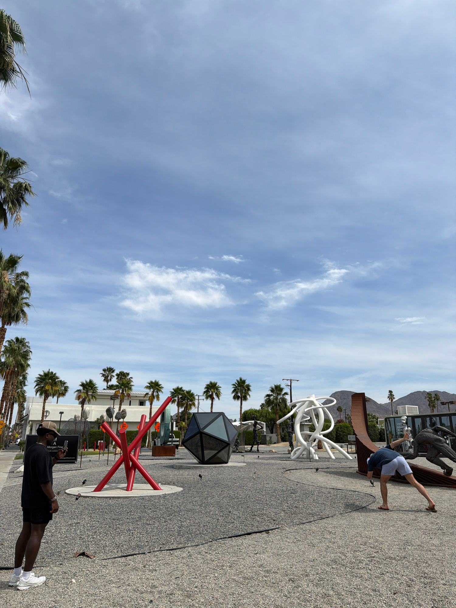 The image captures a scene in Palm Desert, California, United States, likely along El Paseo Drive, known for its public art displays. The photograph is taken from ground level, looking towards a row o…read more