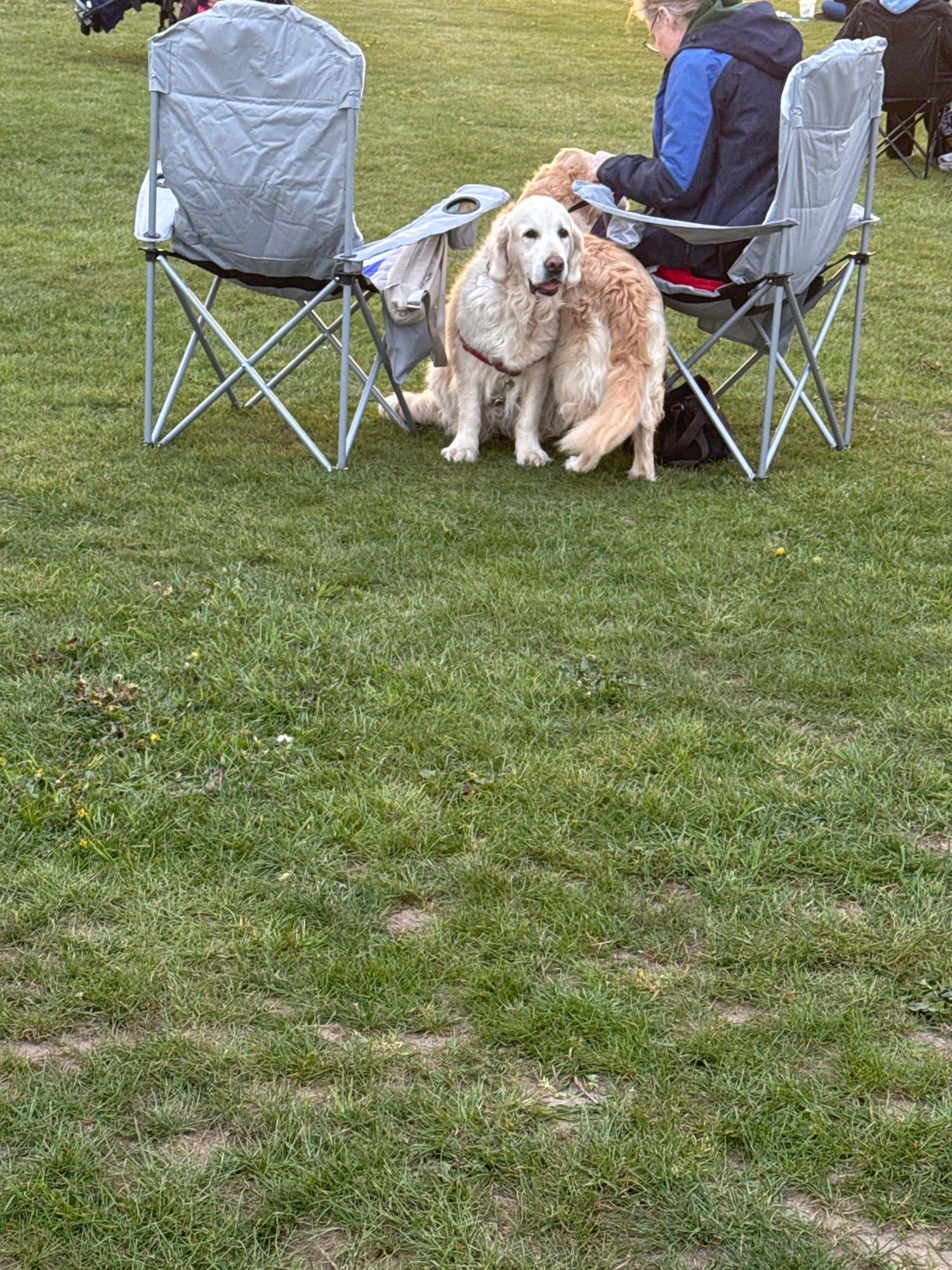 On a grassy field in Norwich, United Kingdom, two golden retriever dogs are nestled together near folding chairs. One dog is primarily white with a red collar, while the other is a golden color. A per…read more