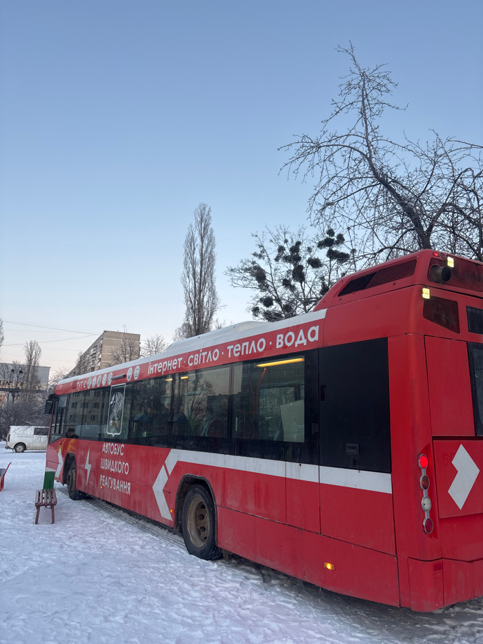 This image depicts a snow-covered urban environment in a city in Ukraine, under a clear, pale blue sky during daylight. The primary subject is a stationary, red and white articulated city bus, positio…read more