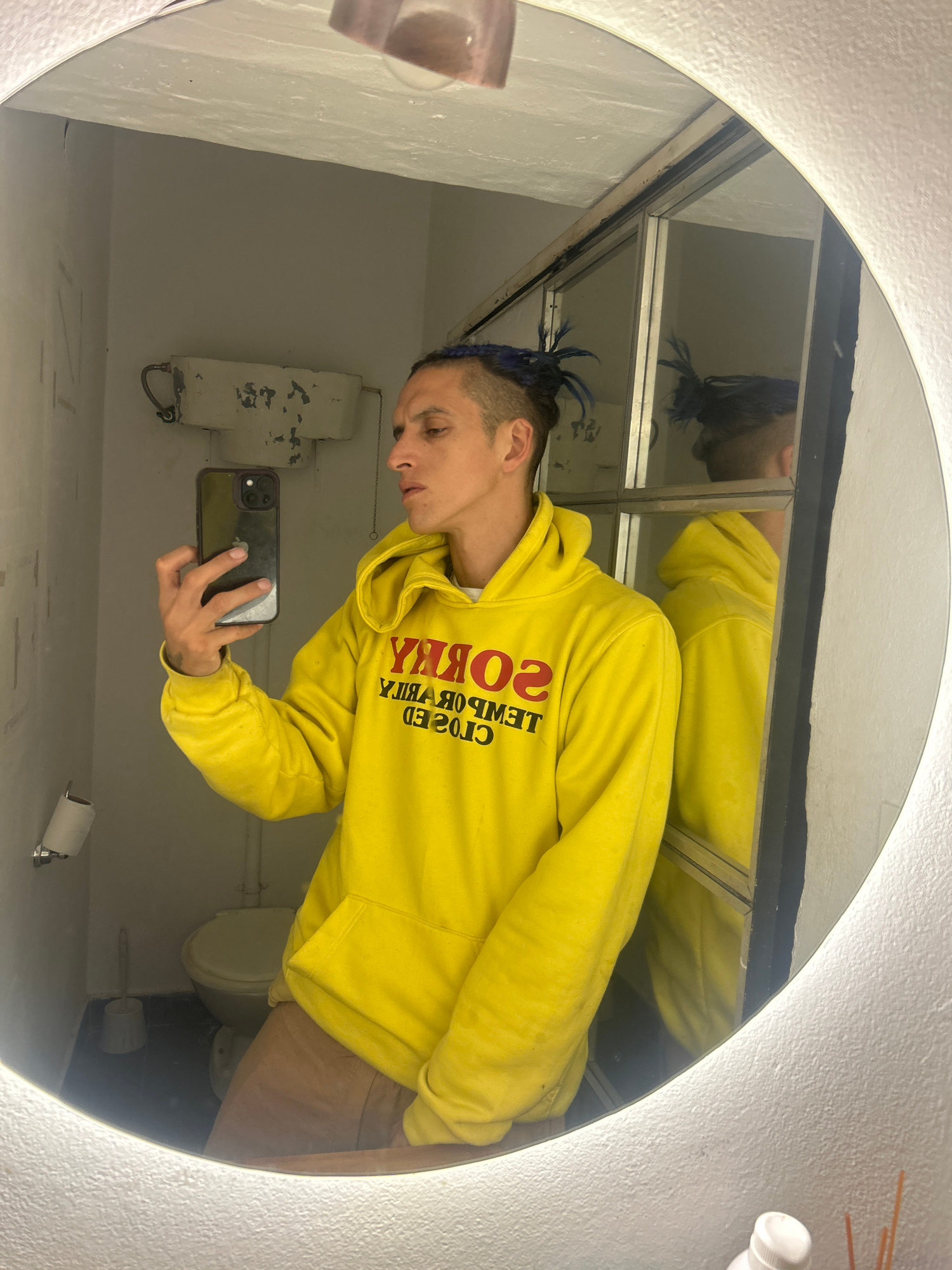 A man with blue-tipped hair is reflected in a circular mirror, taking a selfie with a smartphone. He wears a yellow hoodie with the word "SORRY" printed backward. The bathroom setting includes a toile…read more