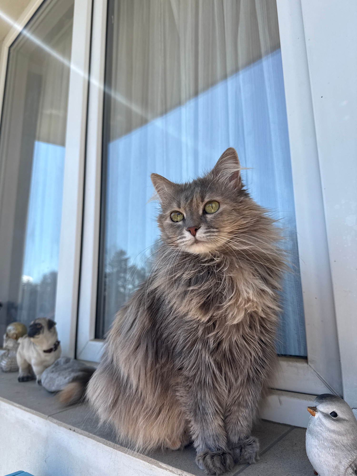 A medium-sized, gray, long-haired cat is perched on a windowsill. The cat has yellow-green eyes and is looking at the camera. To the right of the cat is a white ceramic bird. Below the cat, a small pu…read more