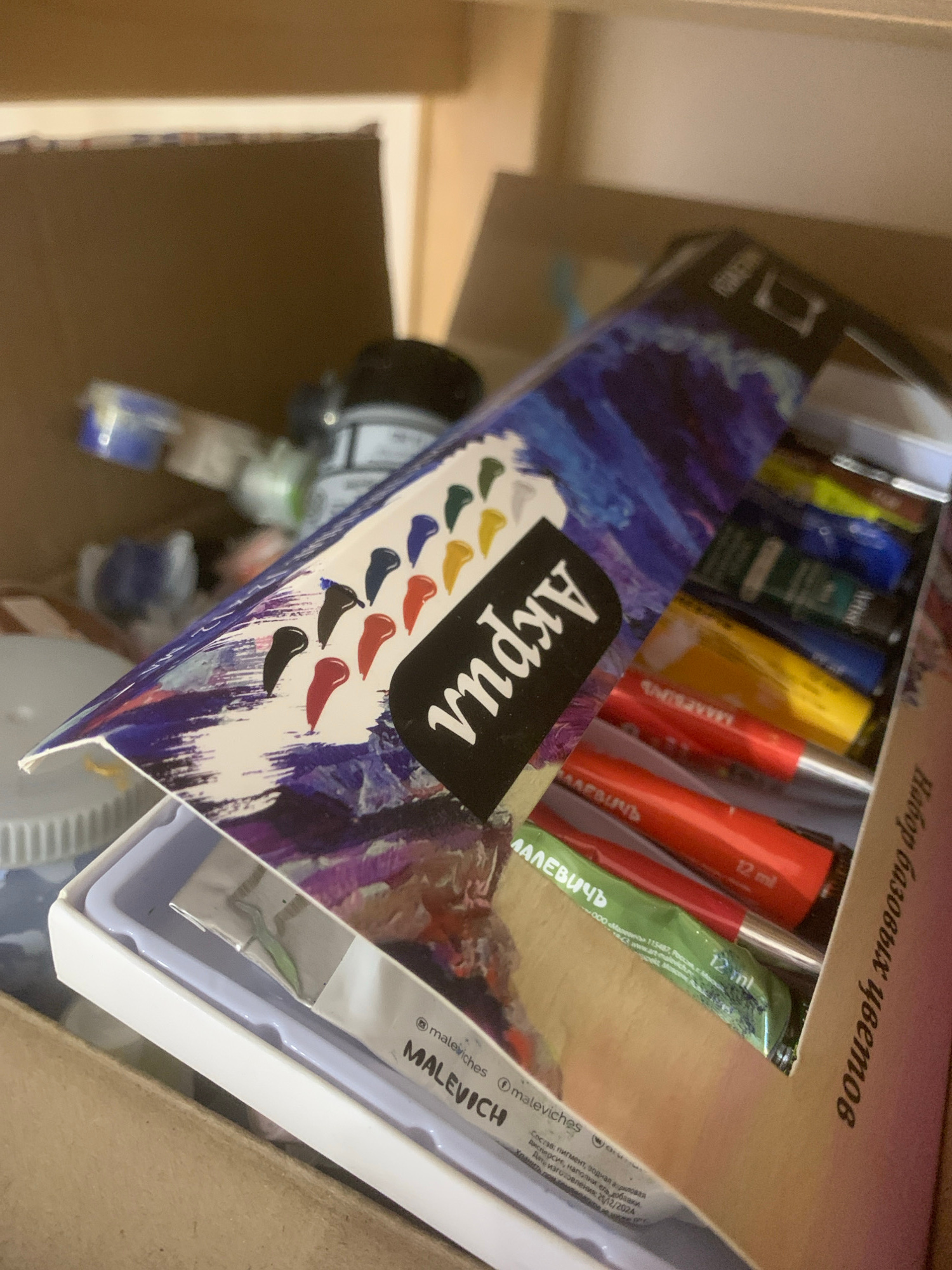 The image shows a box of "Malevich" brand acrylic paints ("Акрил") in a cardboard box. The paint tubes are visible inside, with Russian text on the box and tubes including "Набор базовых цветов" ("Basic set of colors"). The packaging includes the manufacturer's name, "MALEVICH," and other information in Russian, including the date of manufacture, 25/12/2024, and an address. The tube is 12 ml. Other items are also visible inside the cardboard box. The scene is indoors. Izhevsk is not mentioned in the image. | Open Wire