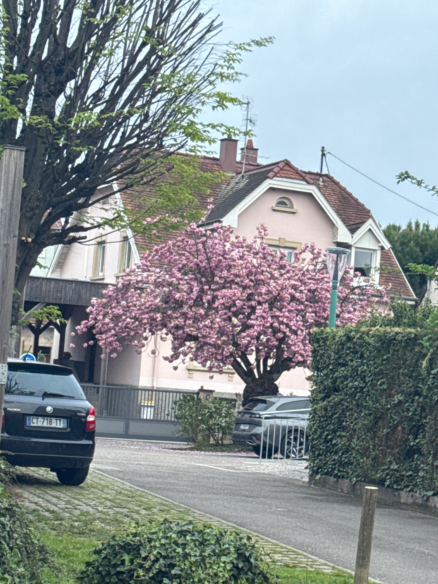 The image captures a street scene in Hoenheim, France. A pink building with a brown roof is visible in the background, partially obscured by a blooming tree with pink blossoms. A black car is parked o…read more