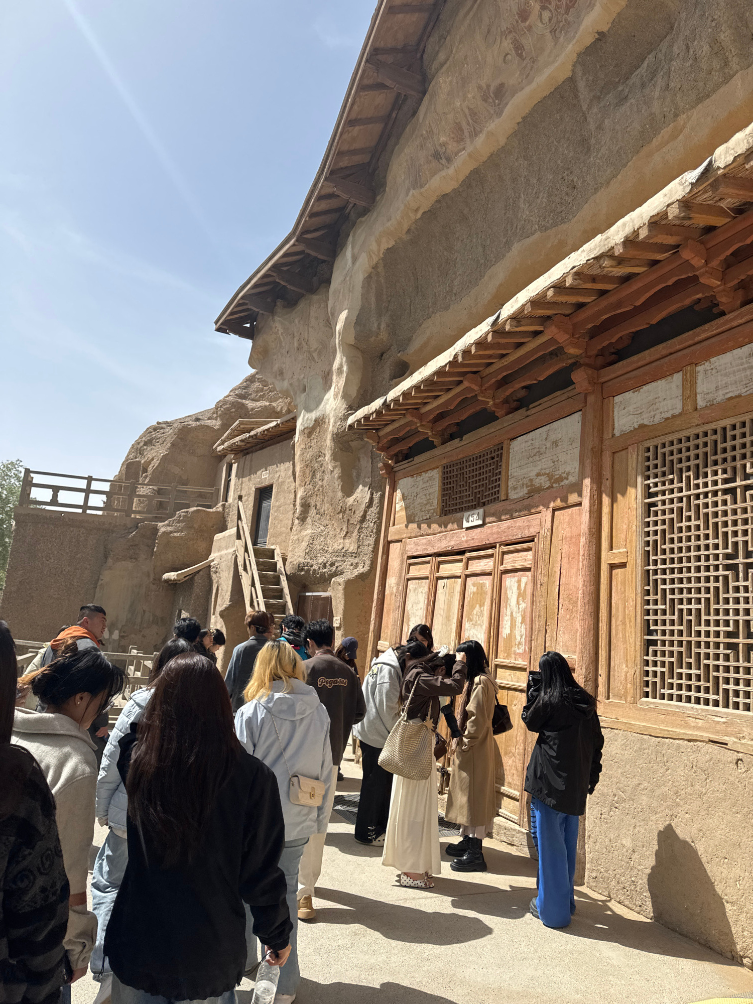 The image shows a group of people, presumably tourists, standing in a line in front of a historic building in Dunhuang City, China. The building appears to be a part of the Mogao Caves complex, judgin…read more