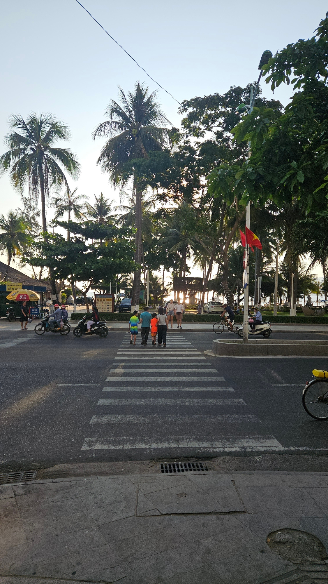 The image shows a street scene in Nha Trang, Vietnam. A group of people are crossing the street at a zebra crossing. Several motorbikes and bicycles are also present on the road. Palm trees line the s…read more