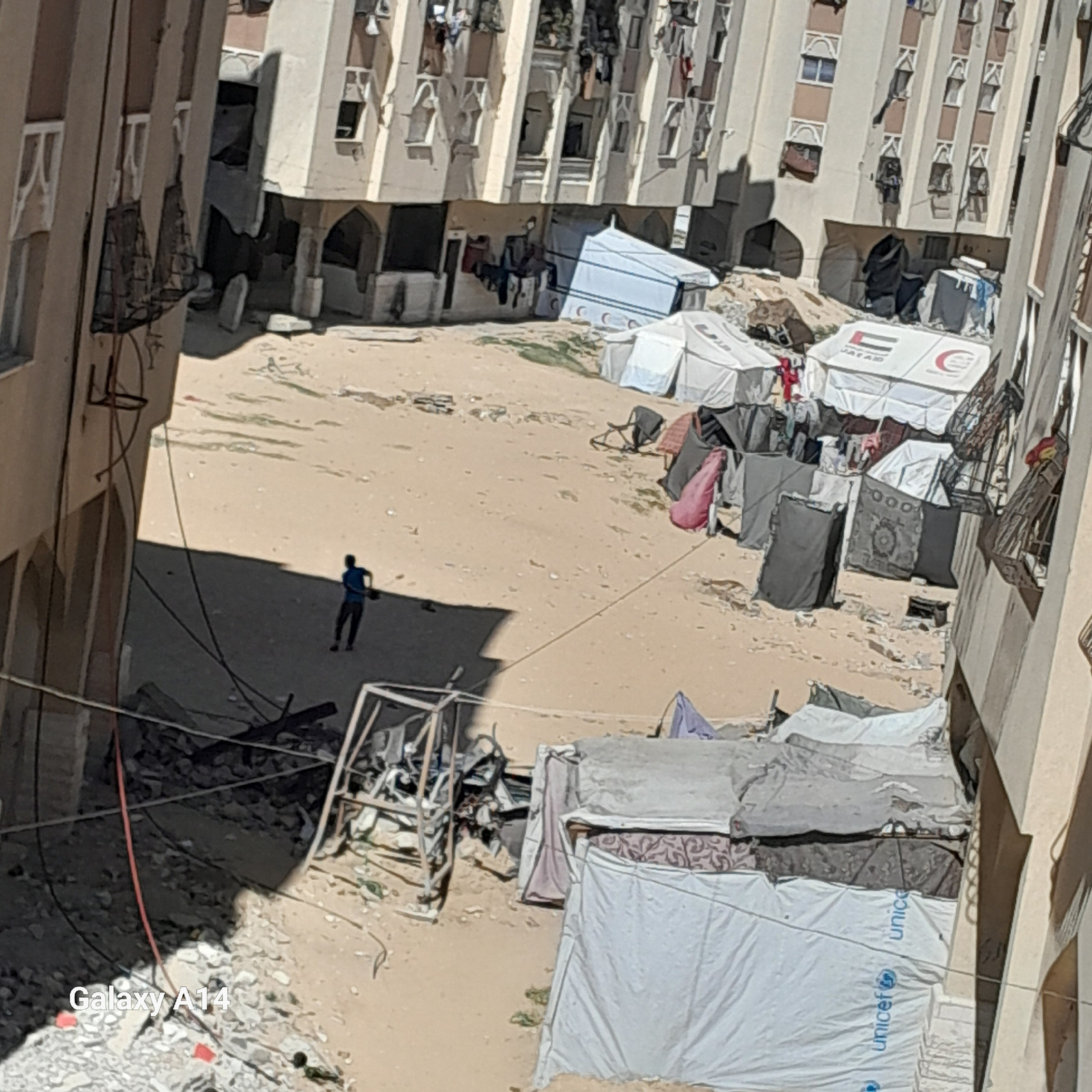 This overhead image captures a scene in Khan Yunis, Palestinian Territory, depicting an outdoor area between buildings, likely serving as a makeshift camp. The ground is predominantly sandy and uneven…read more