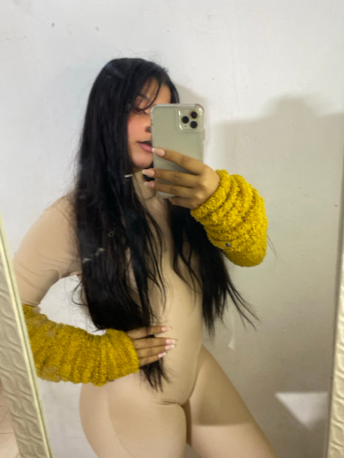 A selfie in a mirror shows a woman with long, dark hair. She is holding a smartphone in front of her face, angled slightly downward. Her nails are painted with a white tip. She is wearing form-fitting…read more