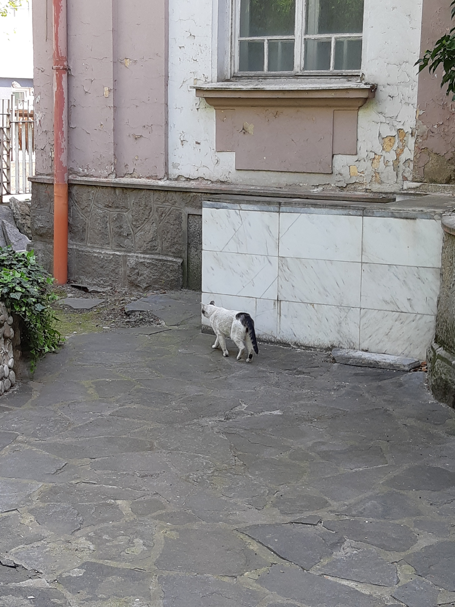 The image depicts a courtyard or alleyway in Plovdiv, Bulgaria. A white cat with a dark patch on its head and back is standing on a gray stone-paved ground. Adjacent to the pavement, there's a buildinβ¦read more