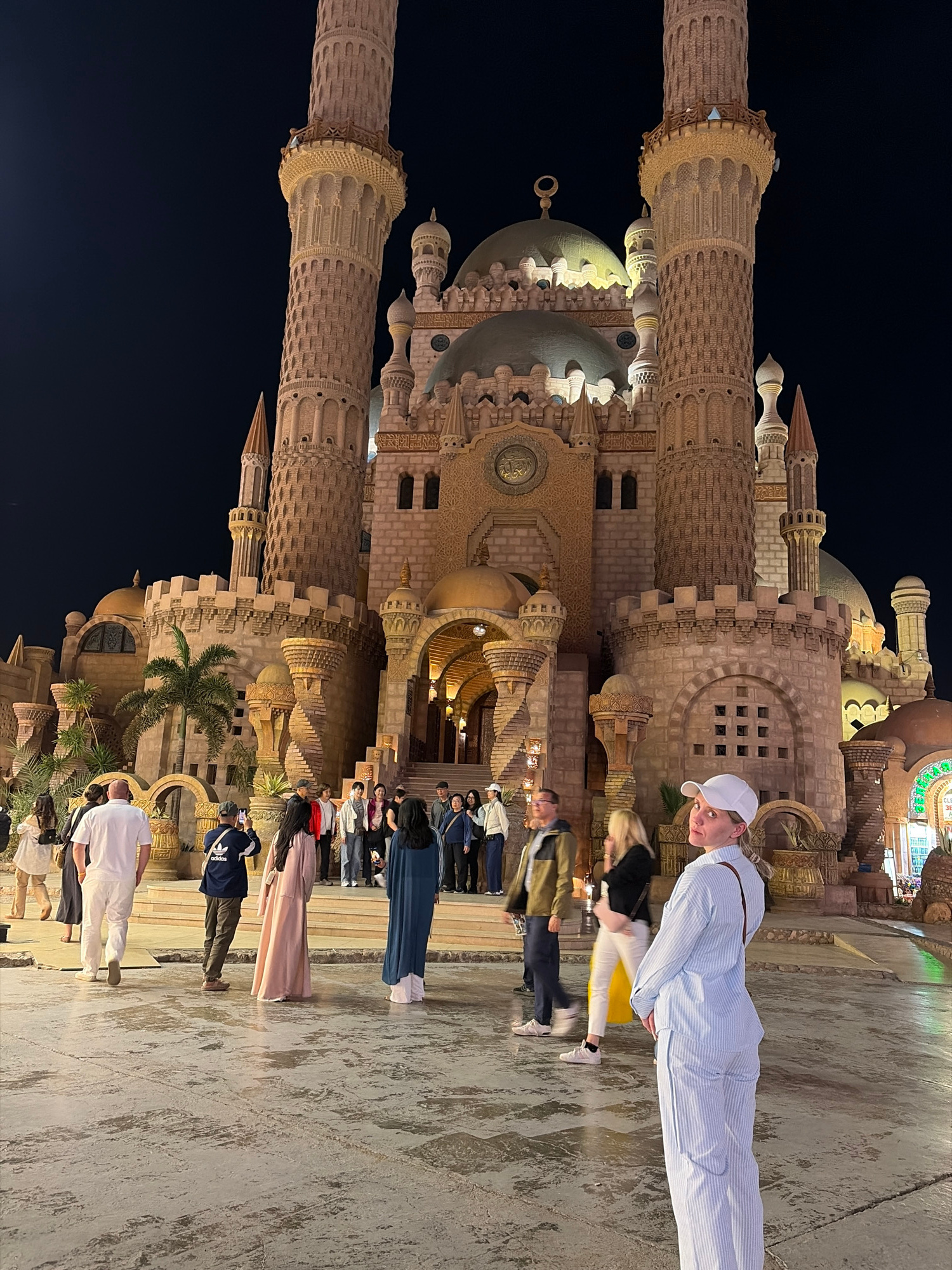 The image depicts the illuminated Al-Sahaba Mosque at night in Sharm El Sheikh, Egypt. The mosque, constructed from light-colored stone, features two prominent minarets with multiple balconies, severa…read more