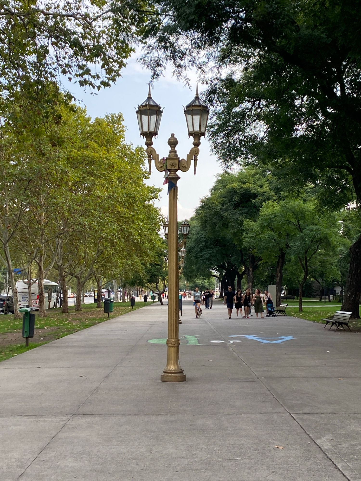 The image captures a scene in Buenos Aires, Argentina, along a wide concrete pathway lined with trees and vintage-style lampposts. A group of people stand in a row, partially obscured by trees, whileβ¦read more