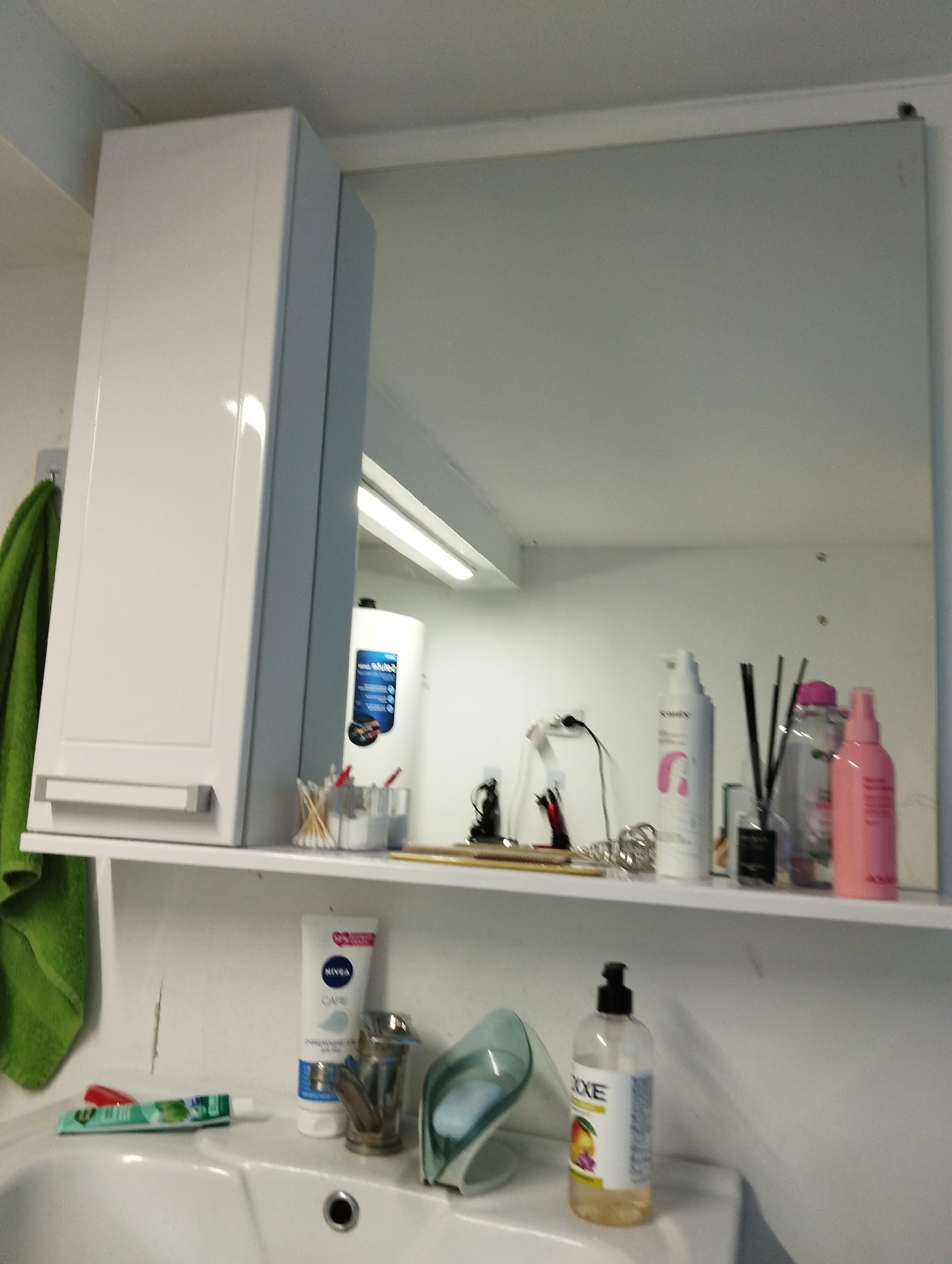 The image shows a bathroom scene, potentially in a residence. There is a white sink, with various toiletries arranged around it, including toothpaste, a tube of Nivea cream, a soap dispenser, and a washbasin. Above the sink, there's a shelf with additional items like cotton swabs, various bottles and containers of beauty products, and some decorative items. The shelf is mounted under a bathroom cabinet on the left and a mirror on the right. A green towel hangs on the left side of the cabinet. A fluorescent light is visible above the shelf in the mirror's reflection. Given the mention of Krasnogorskoye, Russia, the location could potentially be in that region, however, there are no elements in the image itself that pinpoint the exact geographic location. | Open Wire