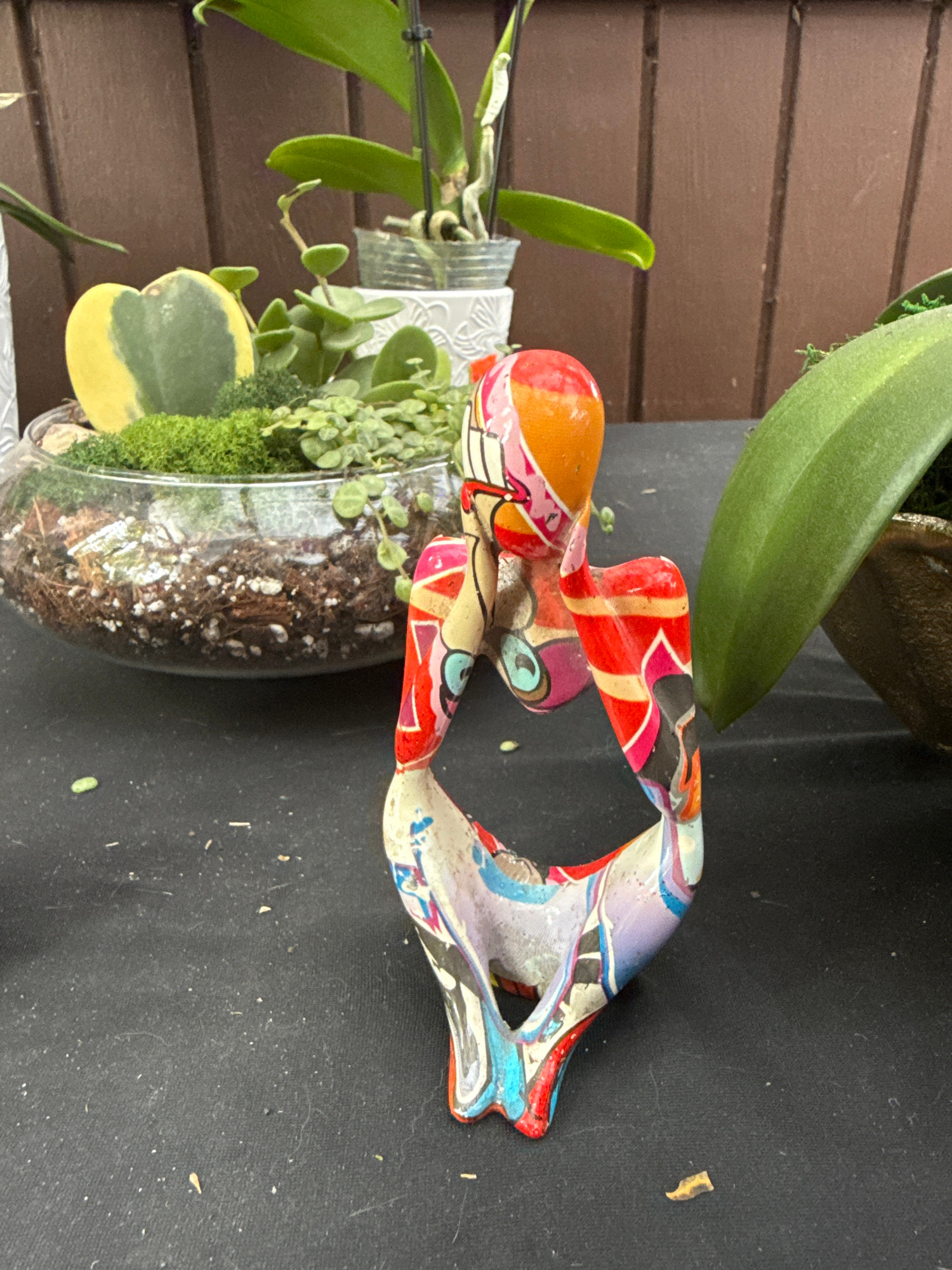 The image shows a still life scene composed of a small, clear glass bowl containing a plant arrangement, alongside a colorful, patterned figurine, set against a backdrop of brown horizontal wooden pla…read more