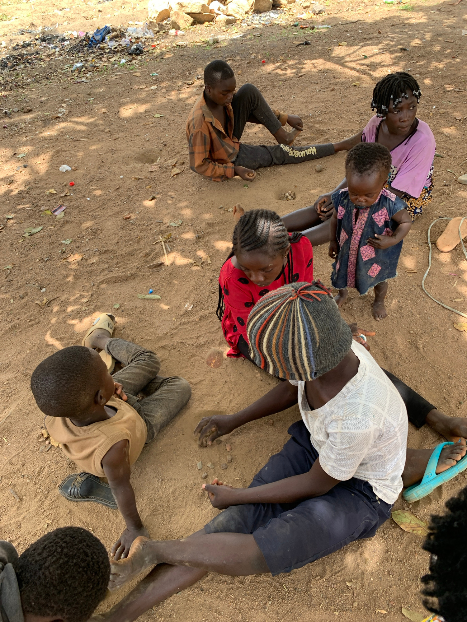 In Rafin Bauna, Nigeria, a group of children are sitting and lying on a dirt ground. At the left, a boy in a plaid shirt has his legs raised. Adjacent to him, a girl wearing a purple shirt and a girl…read more