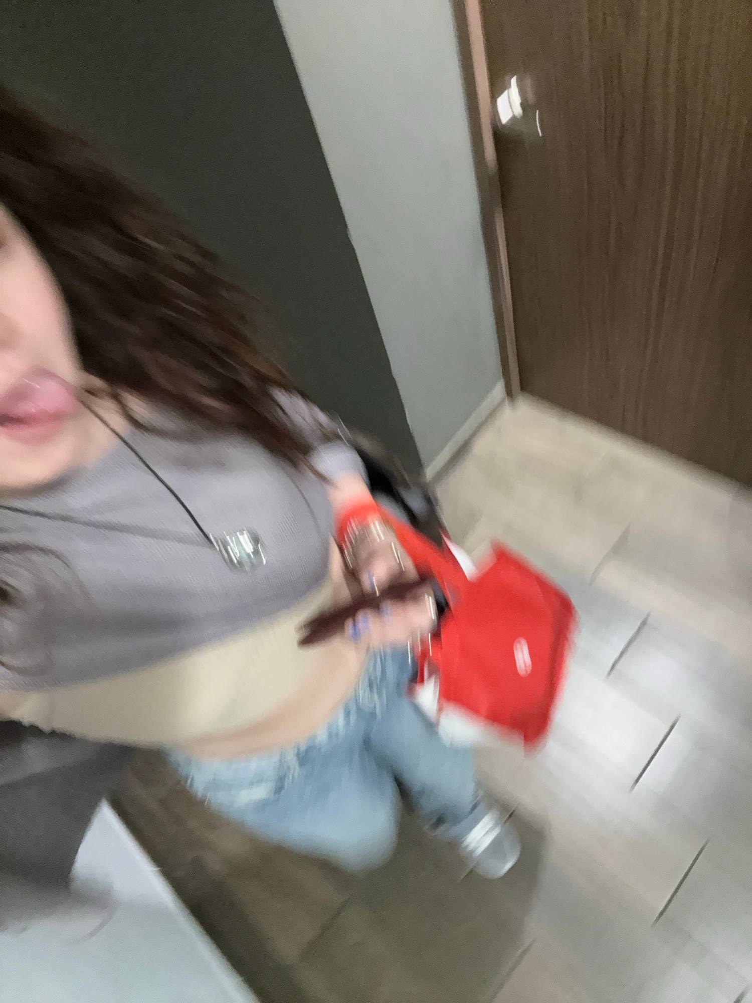 A blurry, close-up, and angled photograph shows a person with long brown hair, wearing a grey top and light-wash denim jeans. They are sticking their tongue out towards the camera. Their right hand is…read more