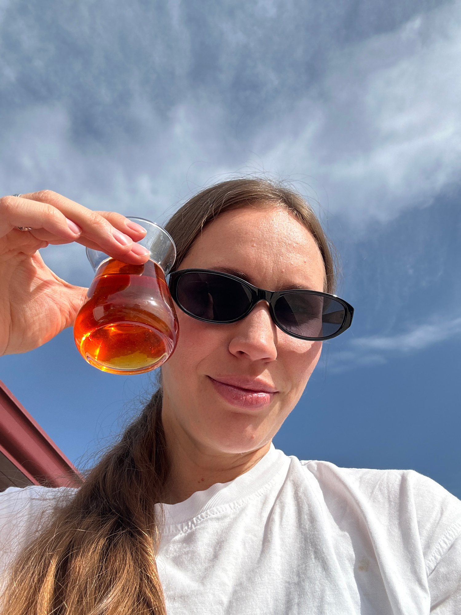A woman wearing sunglasses and a white t-shirt holds a glass of tea against a backdrop of a blue sky with scattered clouds. The angle suggests a selfie or a photo taken from a low vantage point. The l…read more