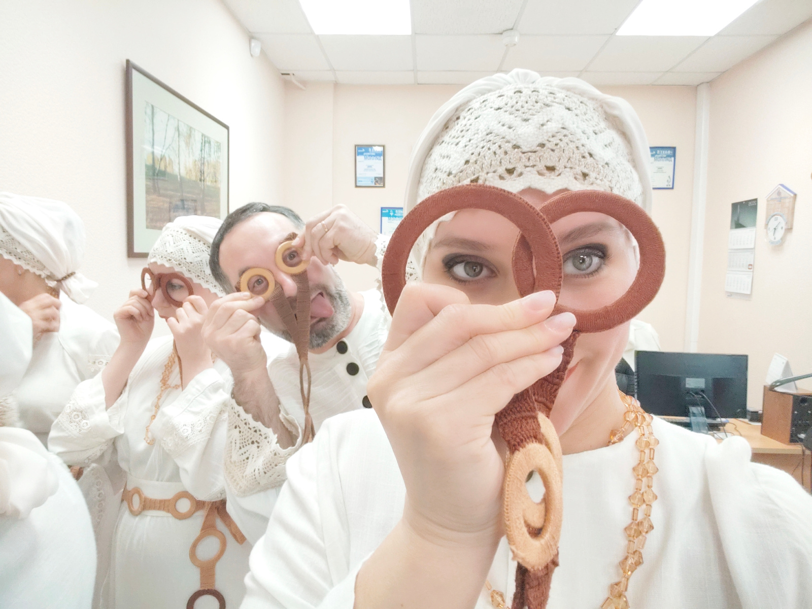 A group of people, four of whom are clearly visible, are posing in an indoor environment that appears to be a room or office space. They all seem to be dressed in similar attire consisting of white cl…read more