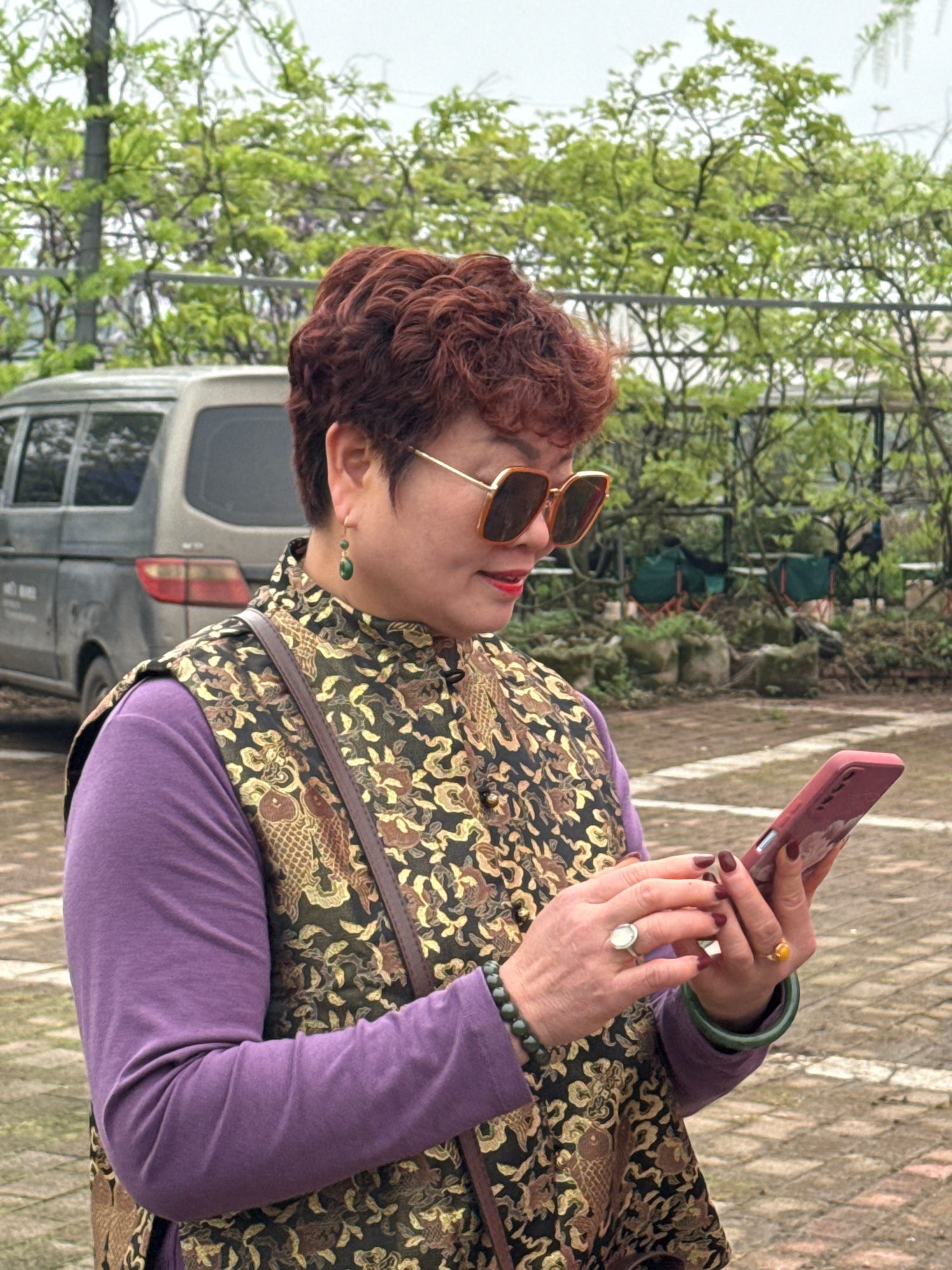 A woman is standing in an outdoor location in what appears to be Xianfeng, China. She is wearing sunglasses, a purple shirt with a patterned vest, and jewelry including rings and bracelets. She is hol…read more