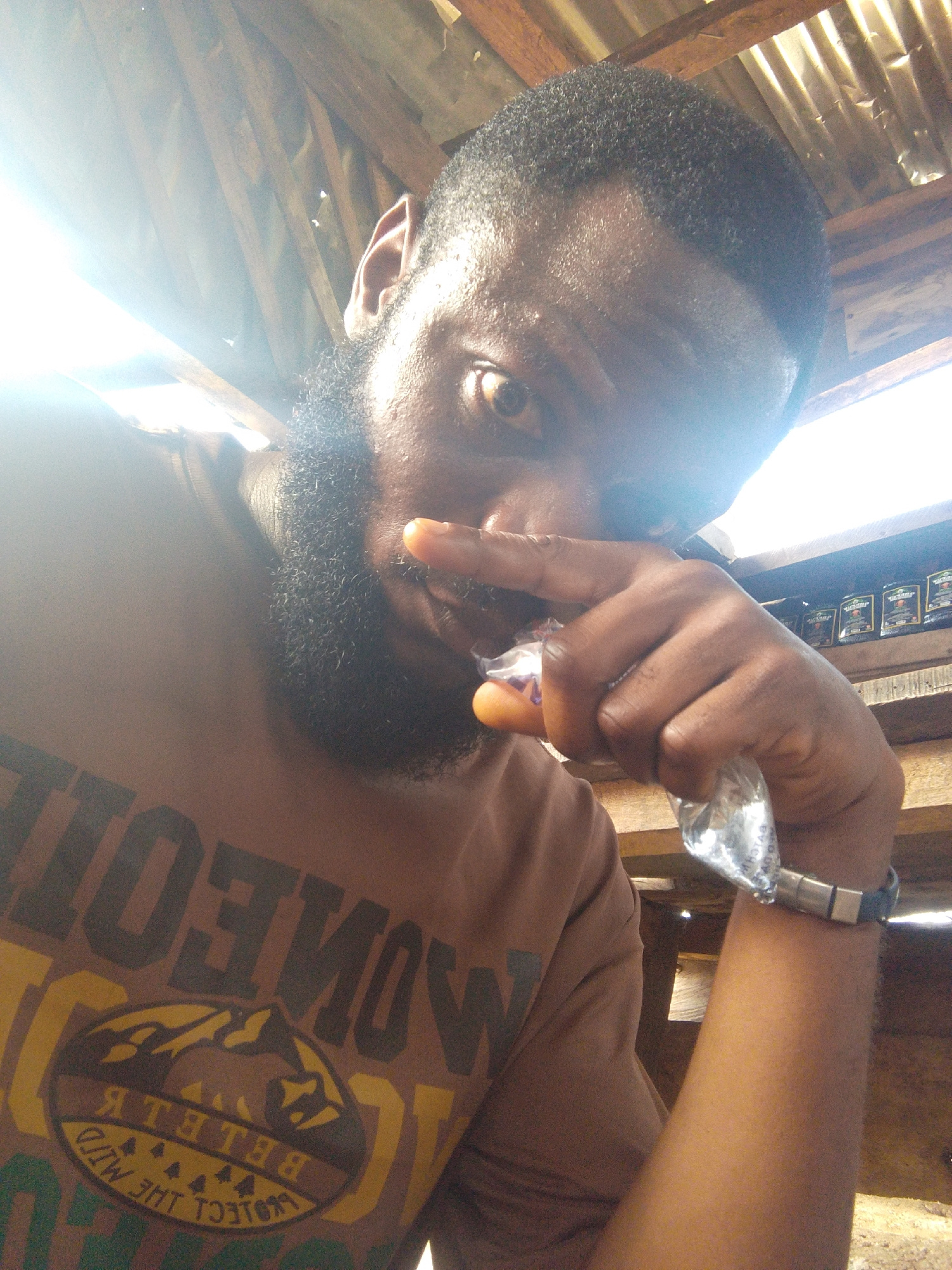 A man with dark skin, a beard, and short hair is holding a small, clear plastic bag near his mouth. He is wearing a brown t-shirt with a graphic design that includes the words "MONEO" and "PROTECT THE…read more